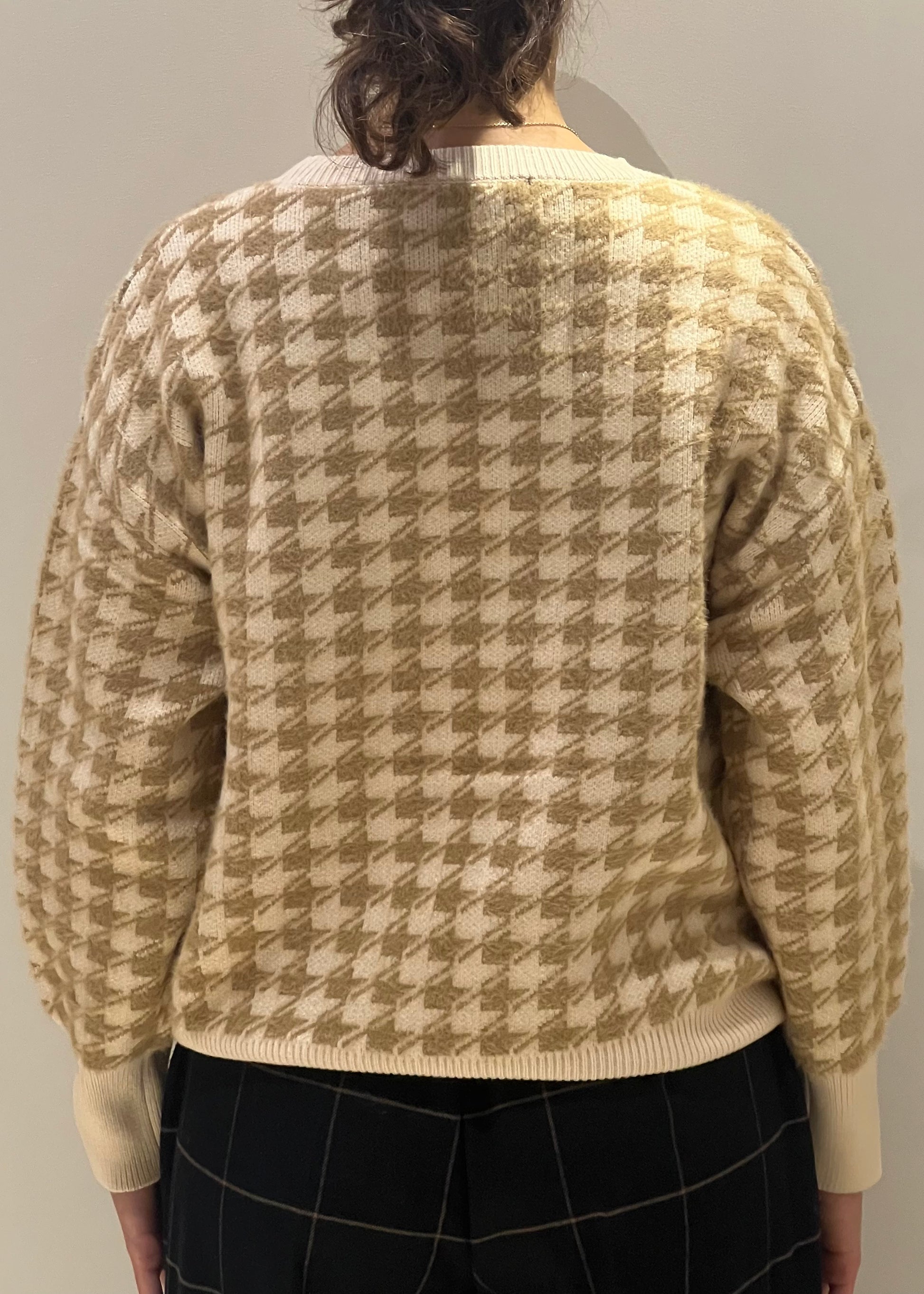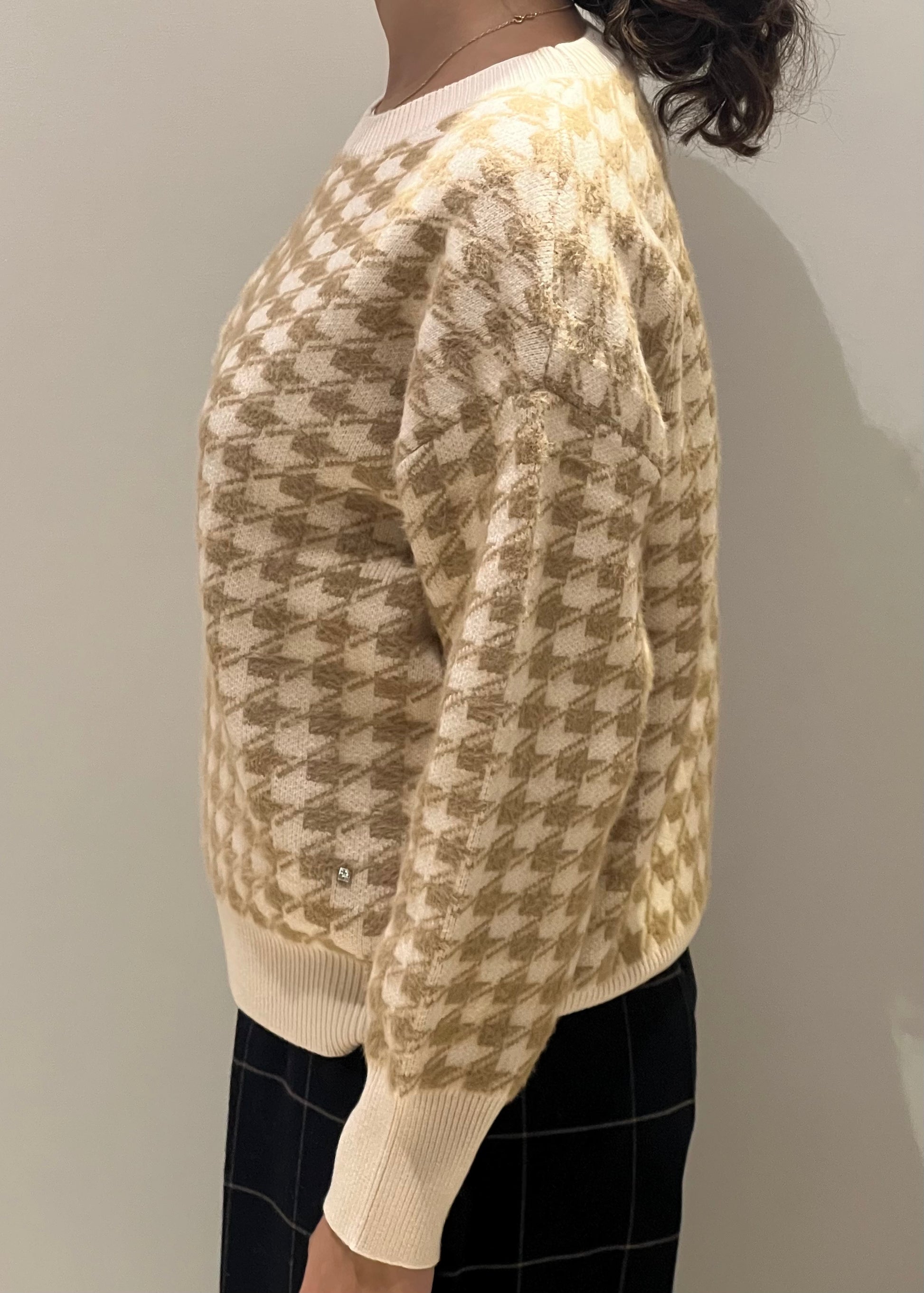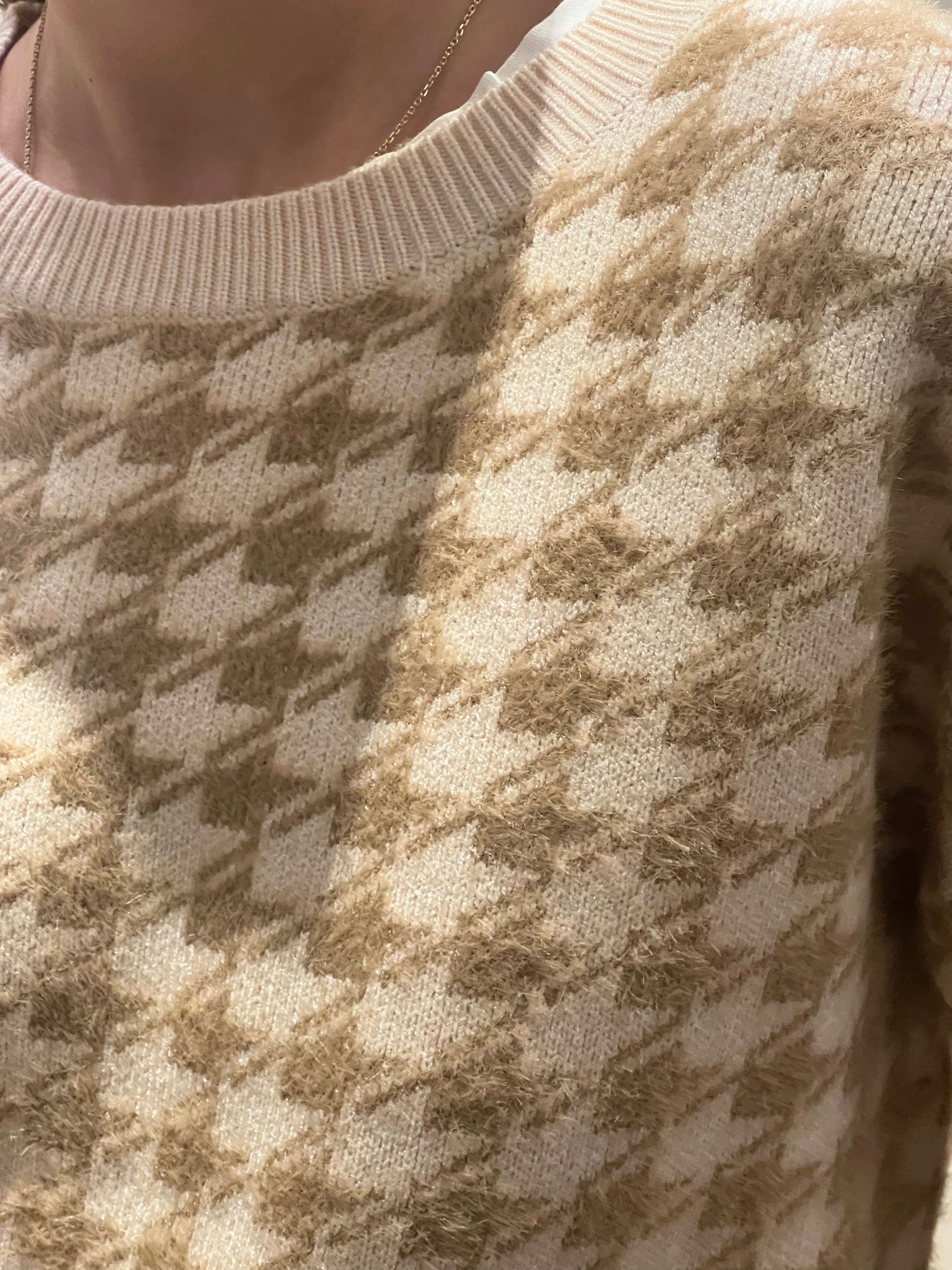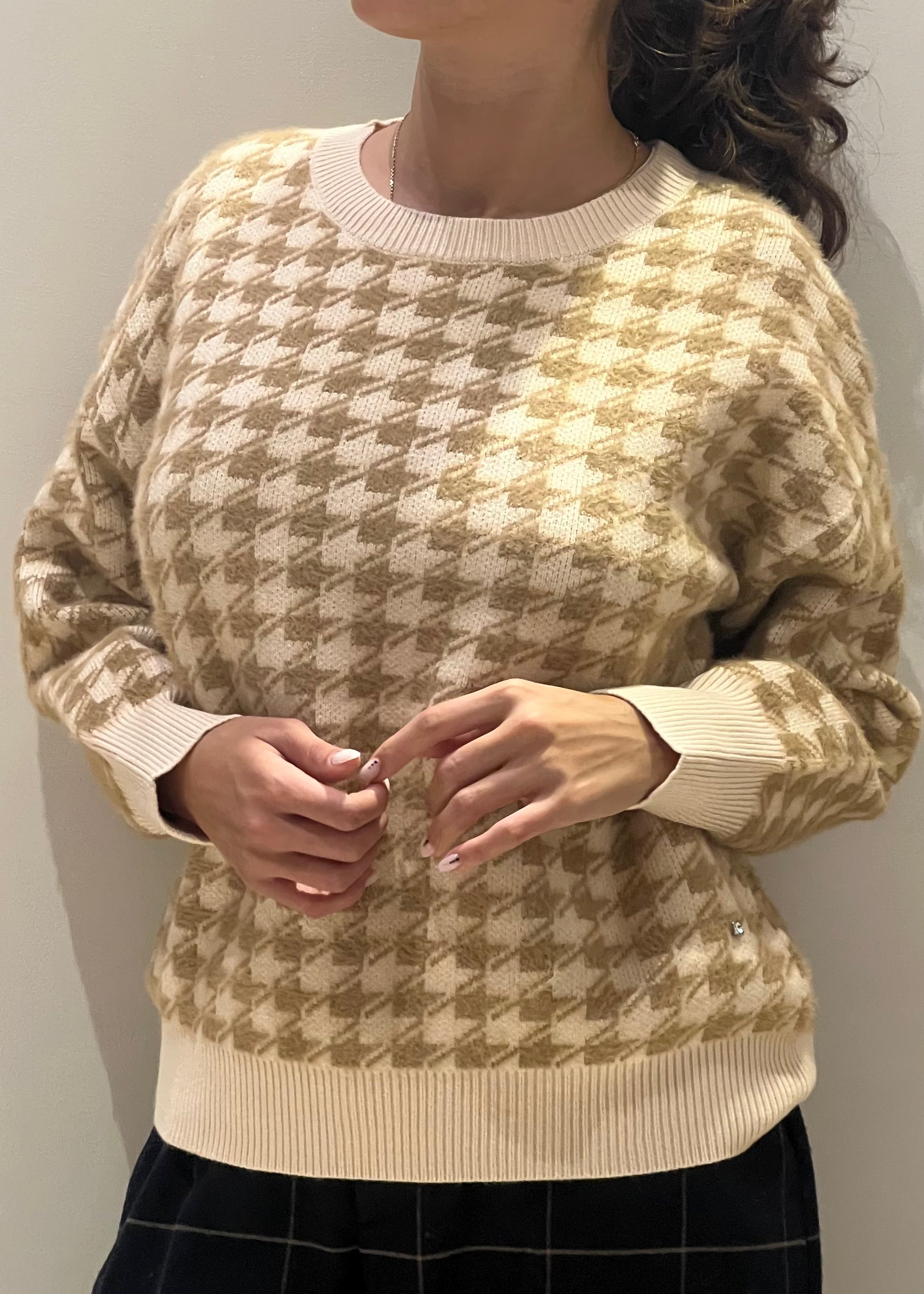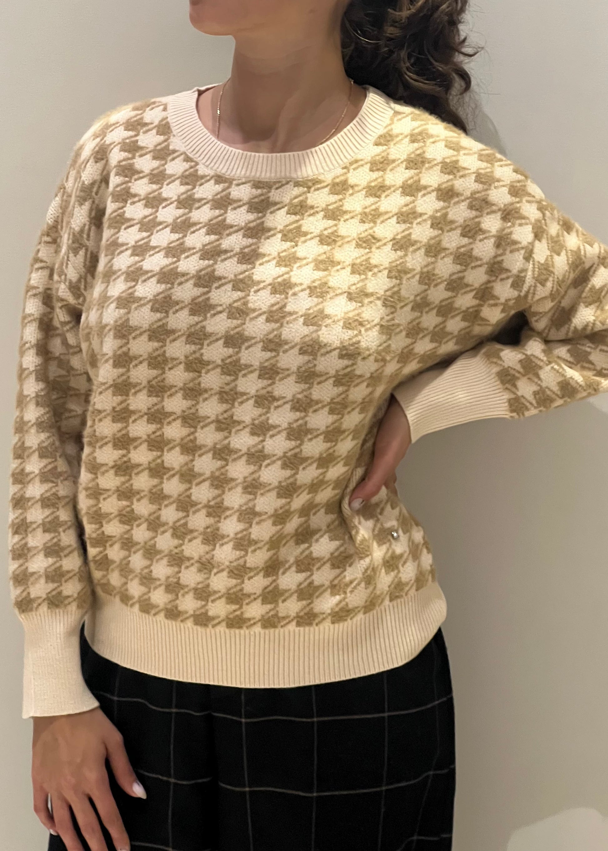 Il maglione in fantasia pied de poule nei toni del beige e crema è un capo casual chic perfetto per aggiungere un tocco classico e sofisticato al guardaroba autunnale e invernale. Realizzato in morbido tessuto di maglia, presenta una vestibilità comoda e leggermente oversize, con maniche lunghe e orli a costine sia sui polsi che sul girovita, per un maggiore comfort. La stampa pied de poule conferisce un aspetto vintage e di tendenza, ideale per abbinamenti con pantaloni a palazzo o gonne per un look elegante ma informale.