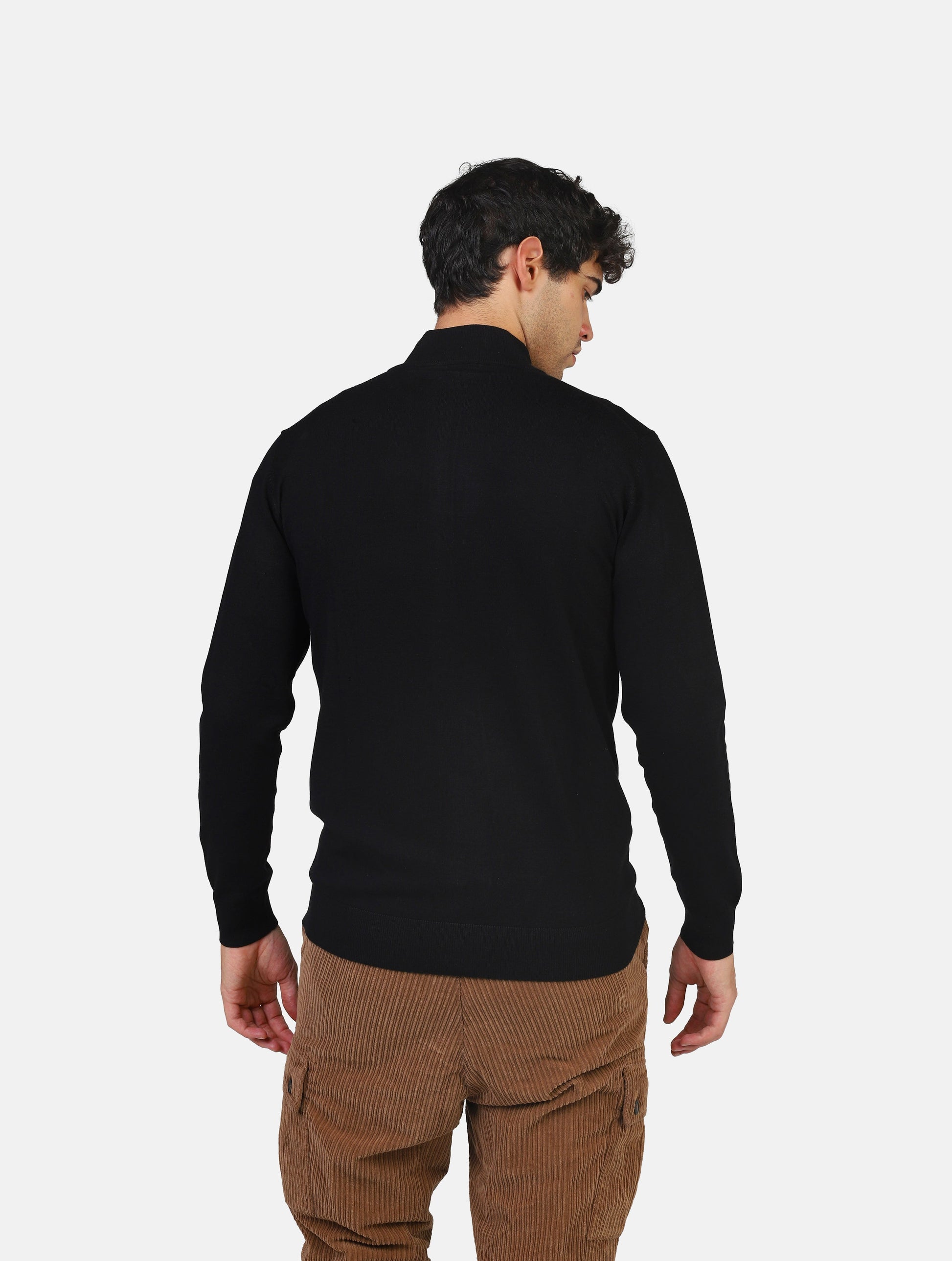 Cardigan da uomo nero con chiusura full zip e collo alto. Polsini e fondo a costine per una vestibilità comoda e aderente. Design minimal e versatile, ideale per look casual o eleganti a strati.