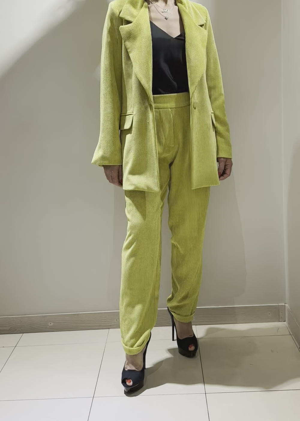 Sperimenta la moda con il Pantalone di Velluto Colore Lime: un capo unico che trasforma ogni giorno in un'occasione per brillare.