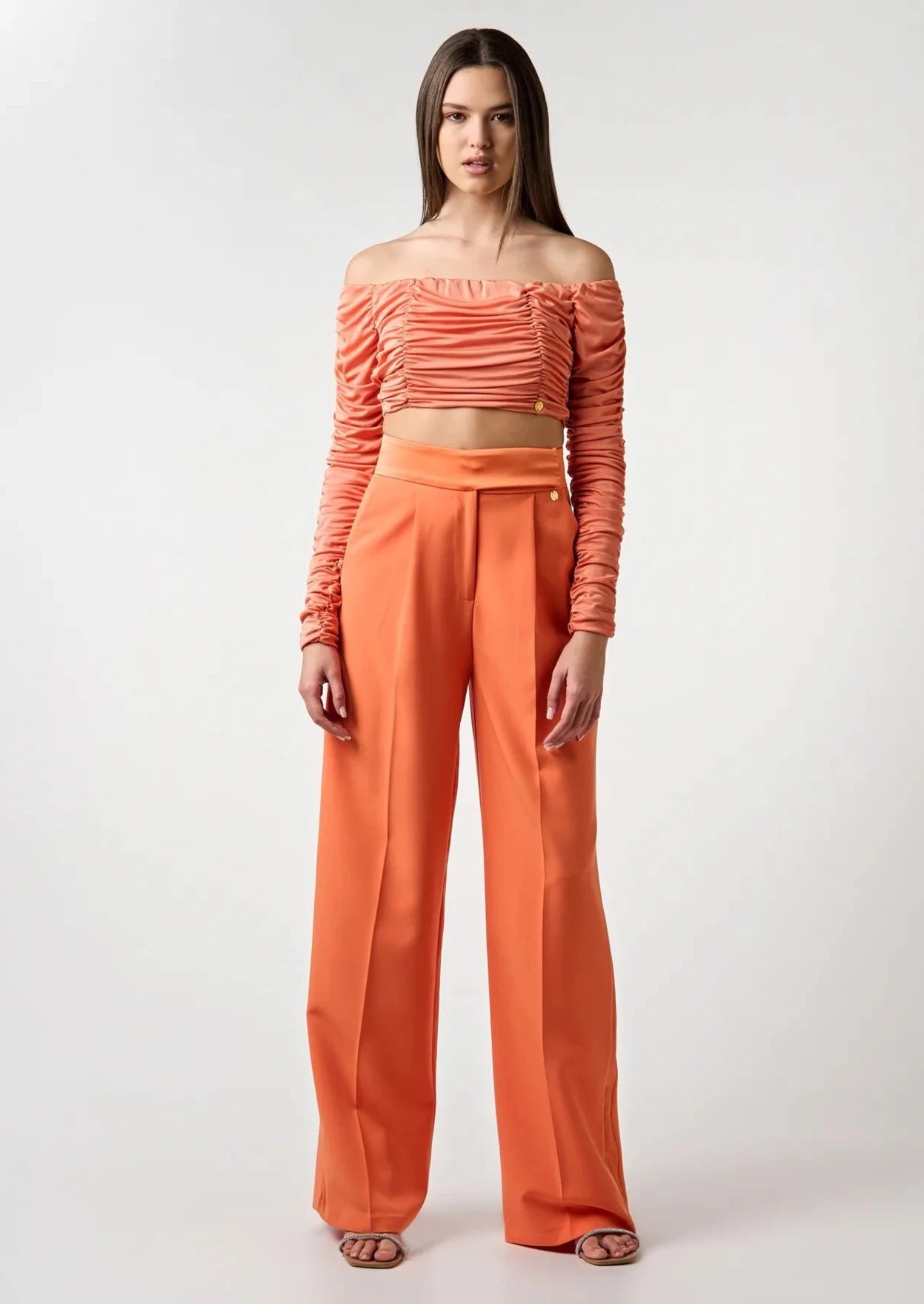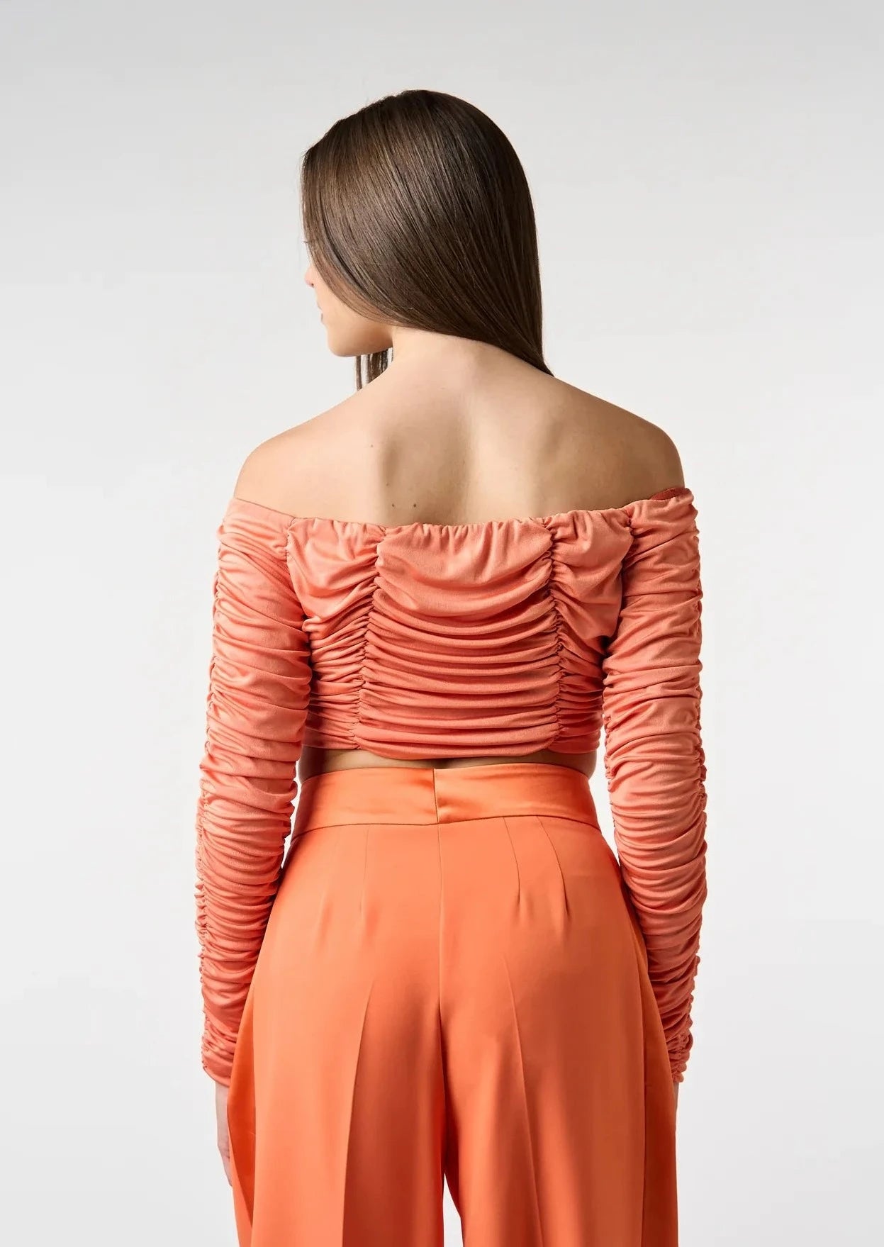 Top in jersey lucido arricciato. Top HELGA scollo a barca e manica lunga