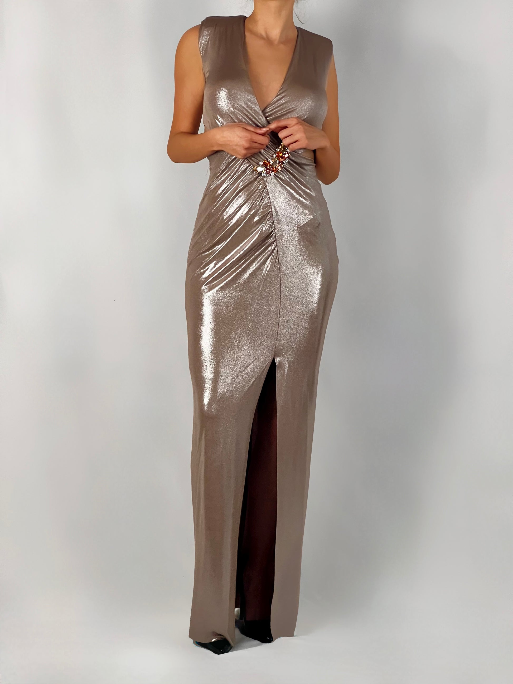 Lo scollo profondo aggiunge un tocco di sensualità, mentre la lunghezza fino al pavimento conferisce un'eleganza senza tempo.