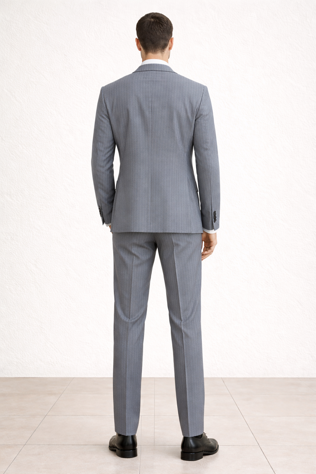 I pantaloni, dal taglio slim, seguono la linea della gamba con precisione, garantendo una vestibilità impeccabile e contemporanea. Completato da una camicia bianca essenziale e scarpe in pelle nera lucida, questo abito è perfetto per occasioni formali, eventi business o cerimonie, offrendo un equilibrio ideale tra stile classico e modernità.
