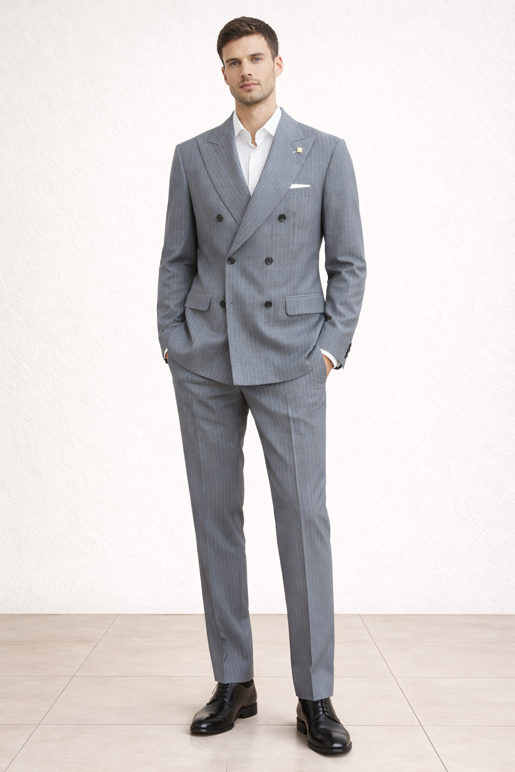 Abito sartoriale dal taglio moderno e raffinato, realizzato in un sofisticato tessuto grigio gessato. La giacca doppiopetto presenta una linea strutturata ma slanciata, con revers ampi e bottoni tono su tono che esaltano l’eleganza senza tempo del capo. Il dettaglio del taschino con pochette e la spilla discreta aggiungono un tocco di personalità e classe.