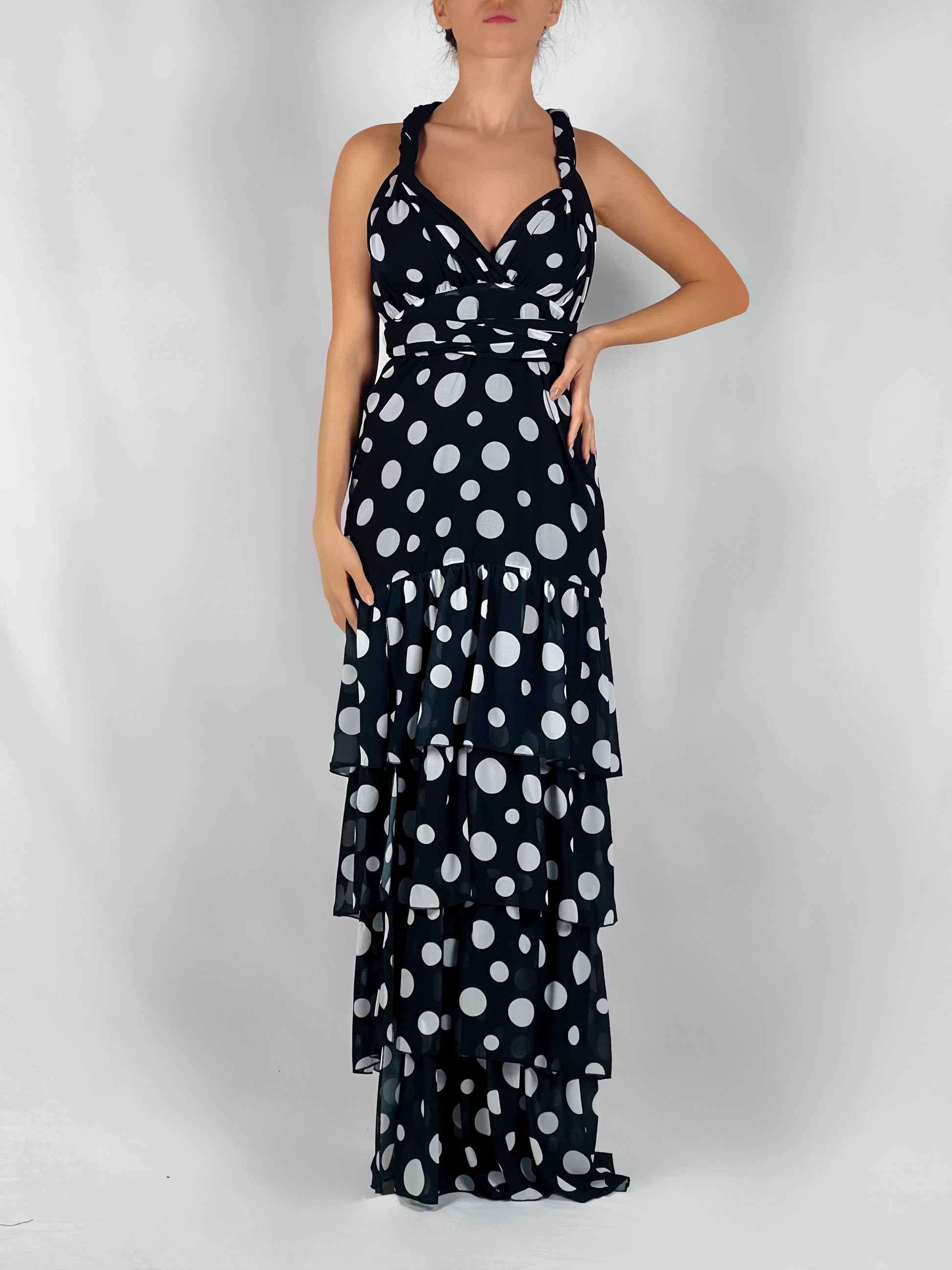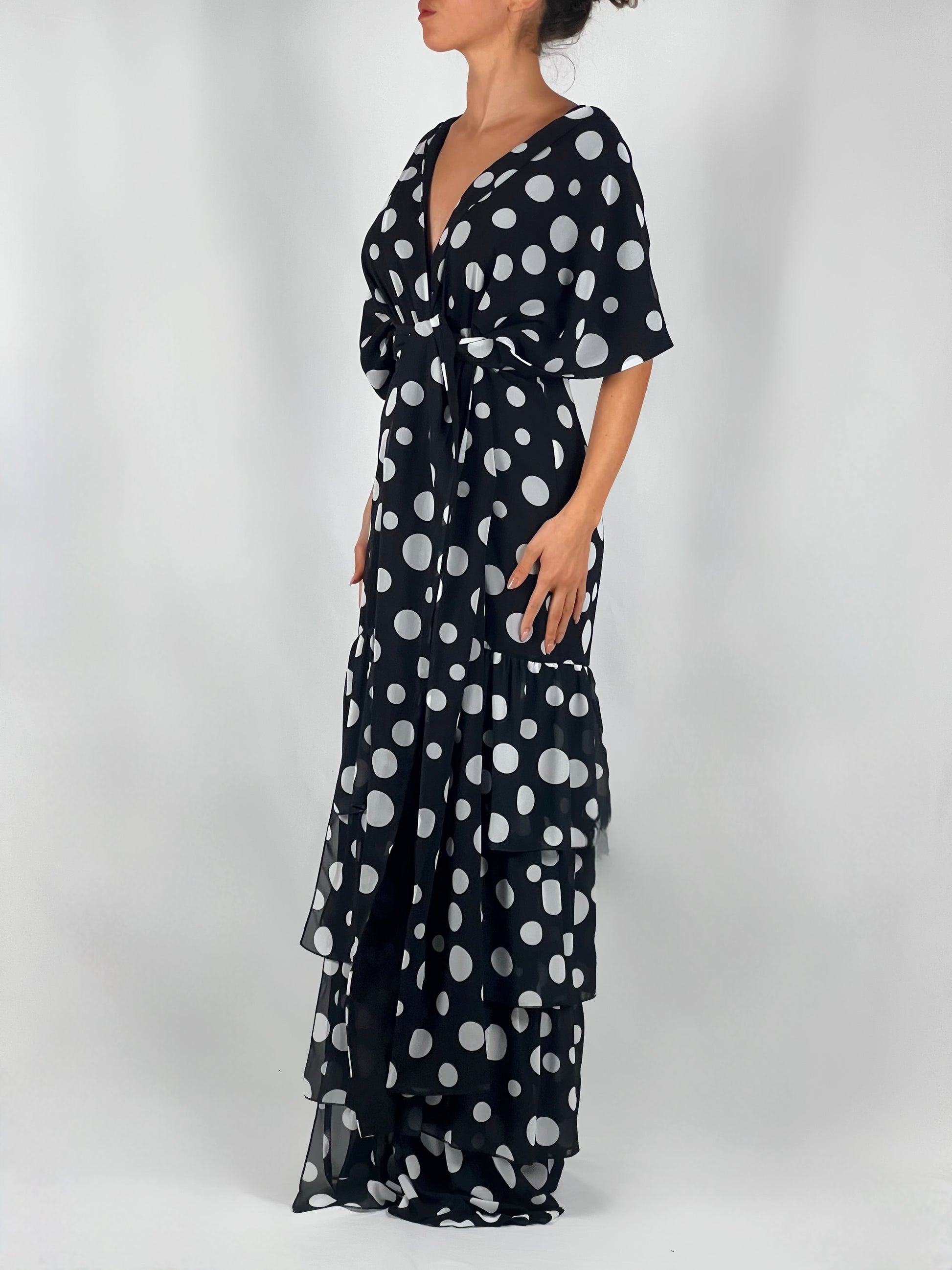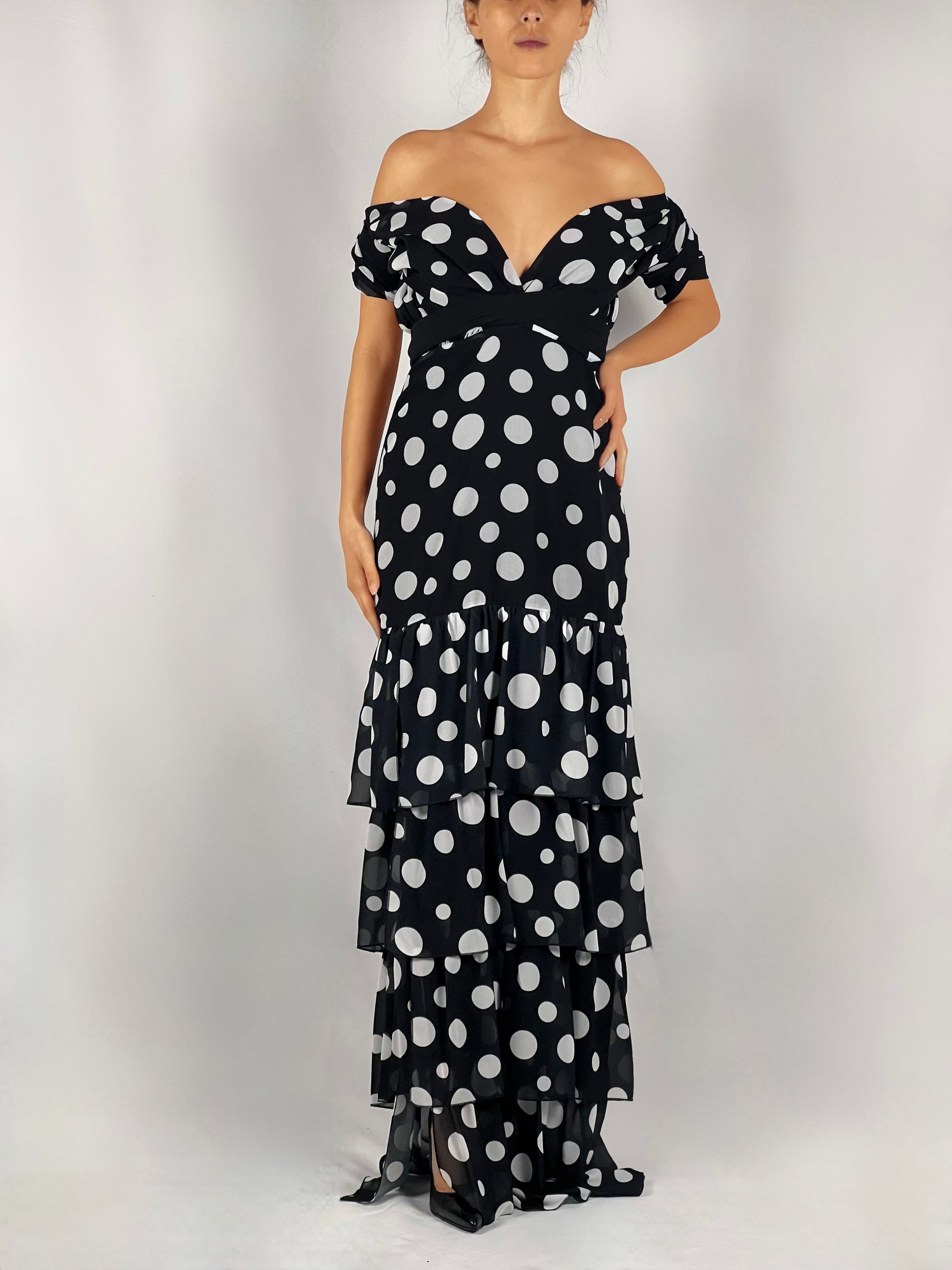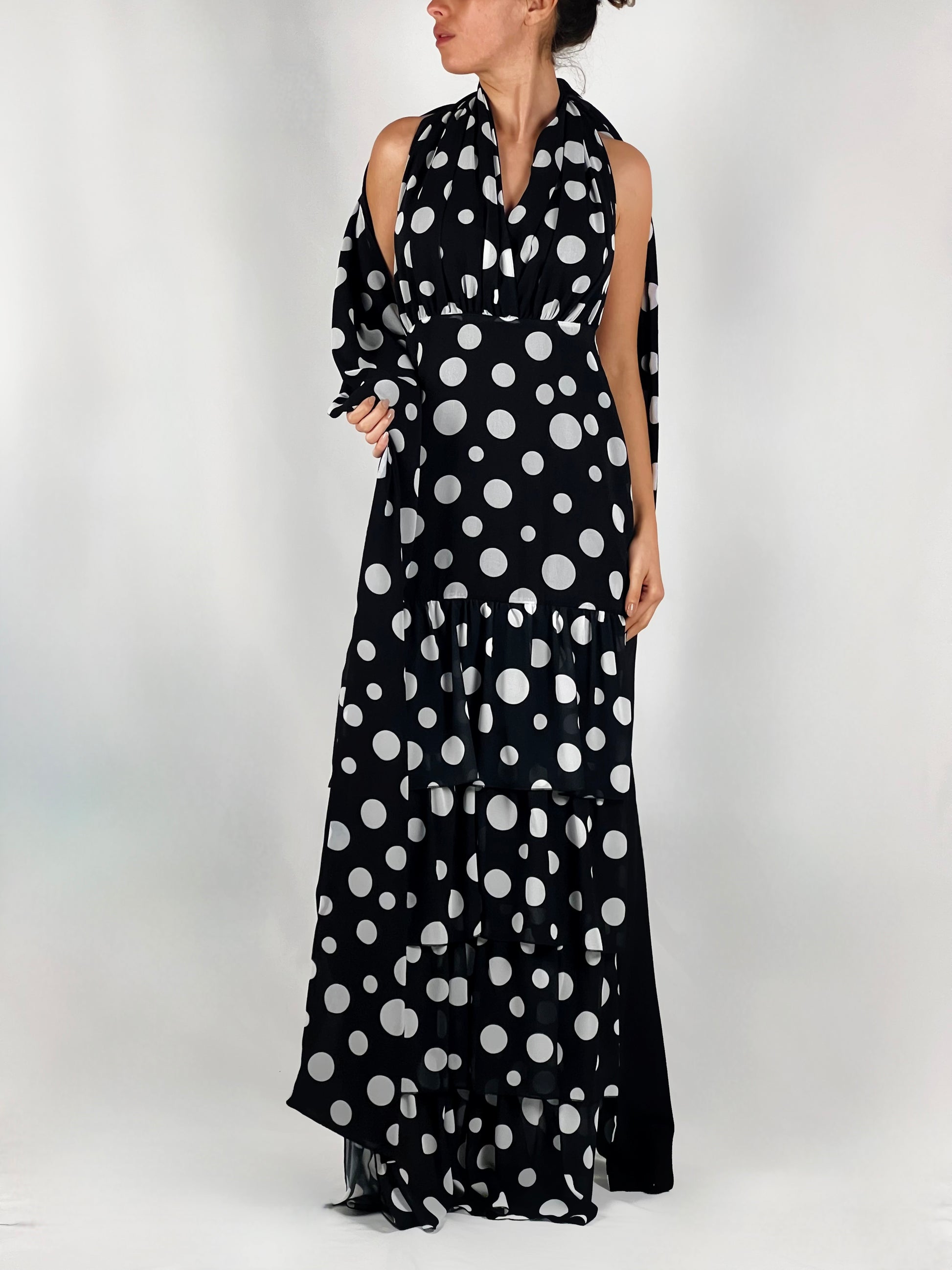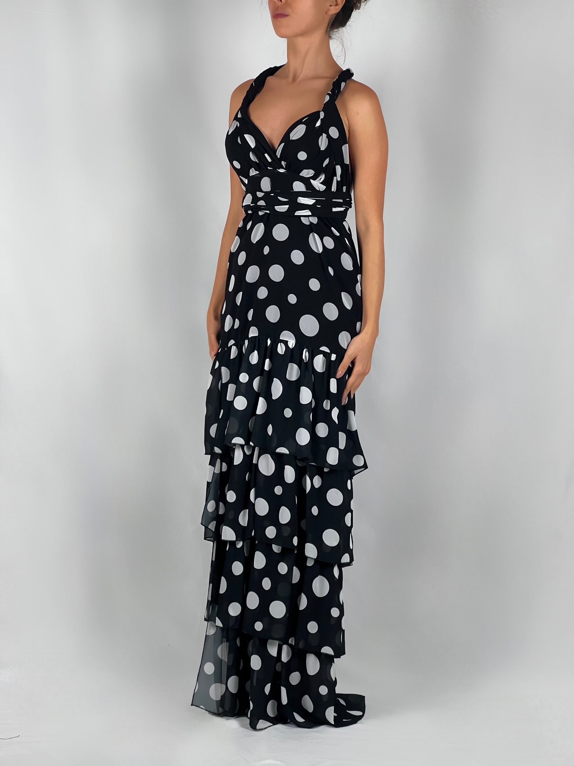Il velato tessuto nero, arricchito da tocchi bianchi, conferisce una raffinata aura di mistero e sofisticazione.