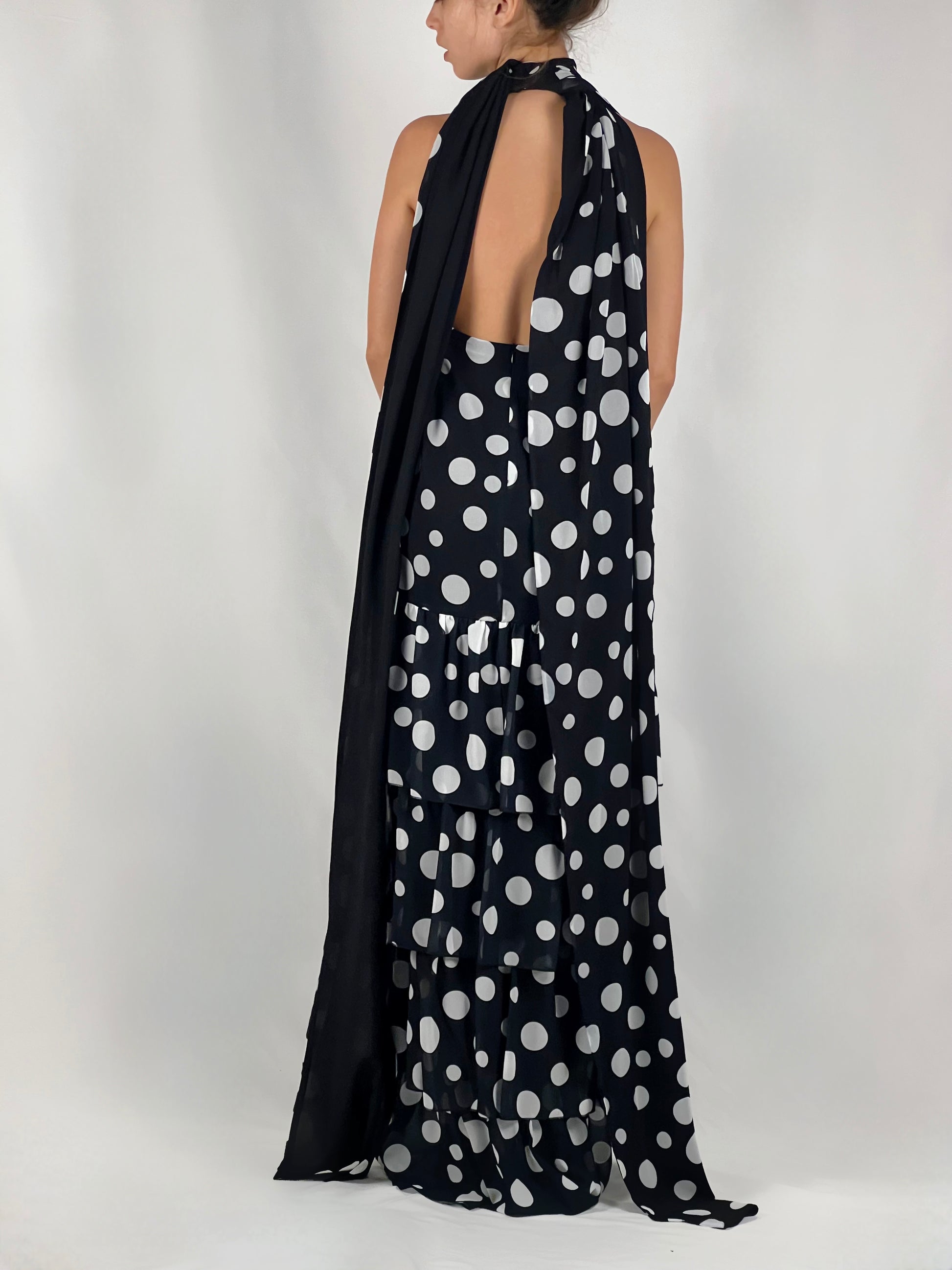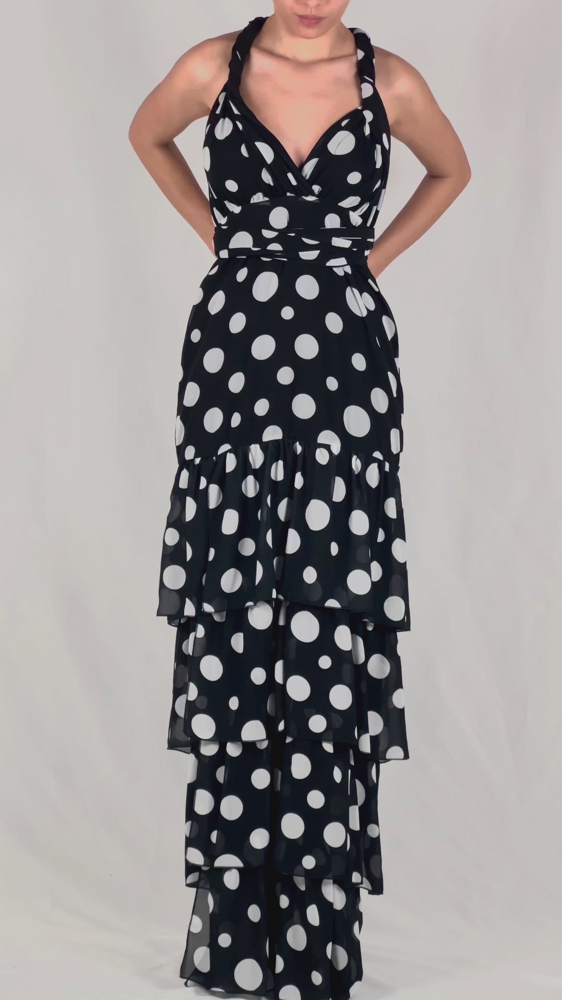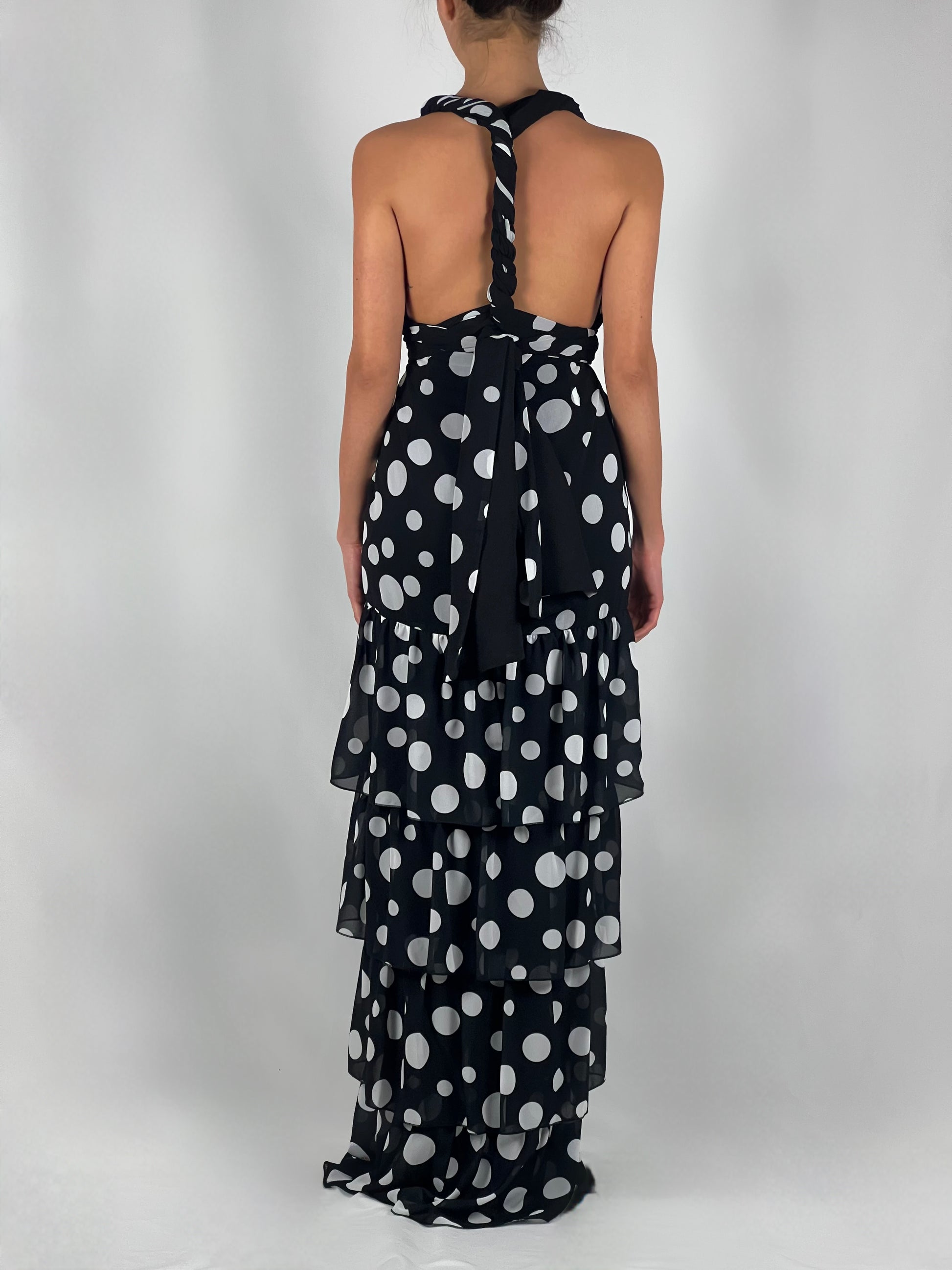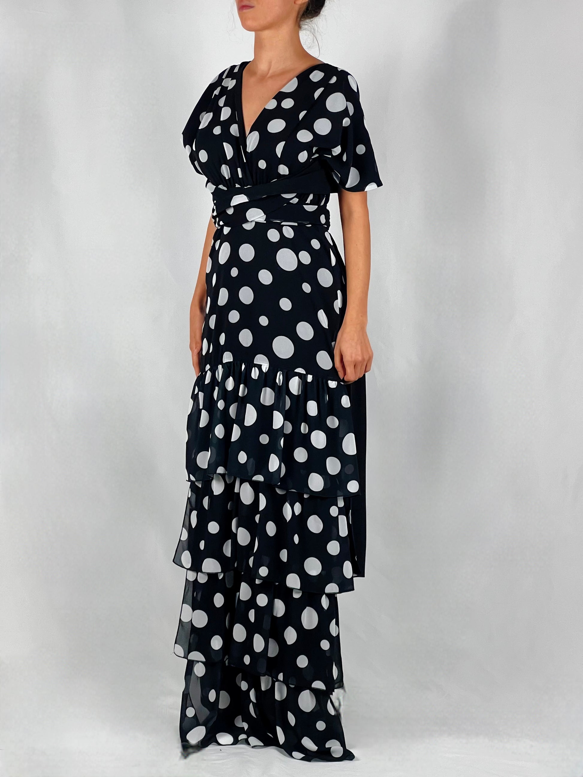 Il velato tessuto nero, arricchito da tocchi bianchi, conferisce una raffinata aura di mistero e sofisticazione.