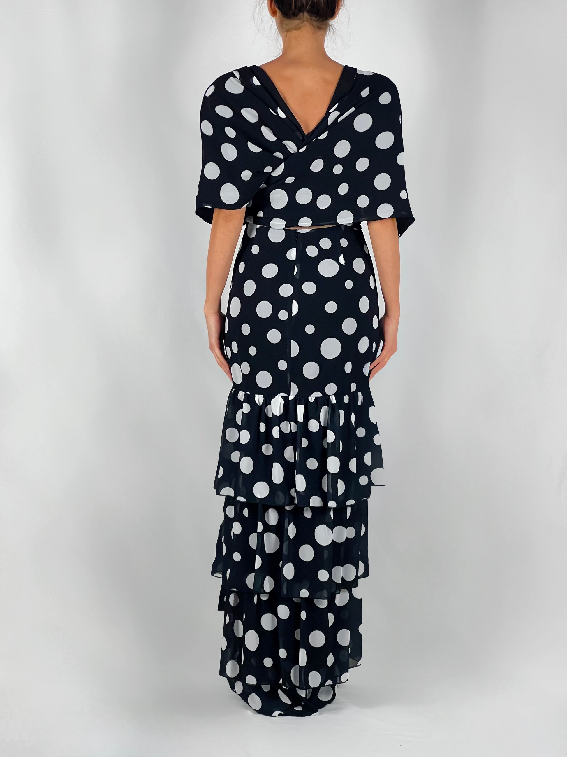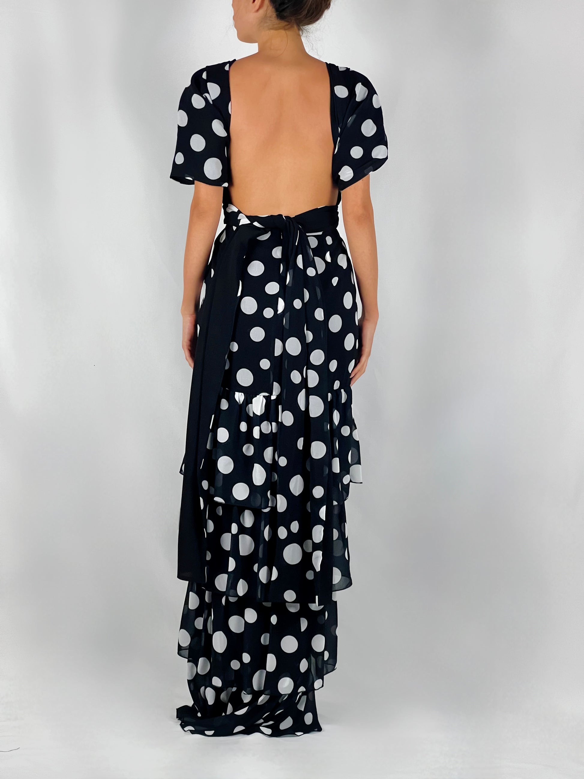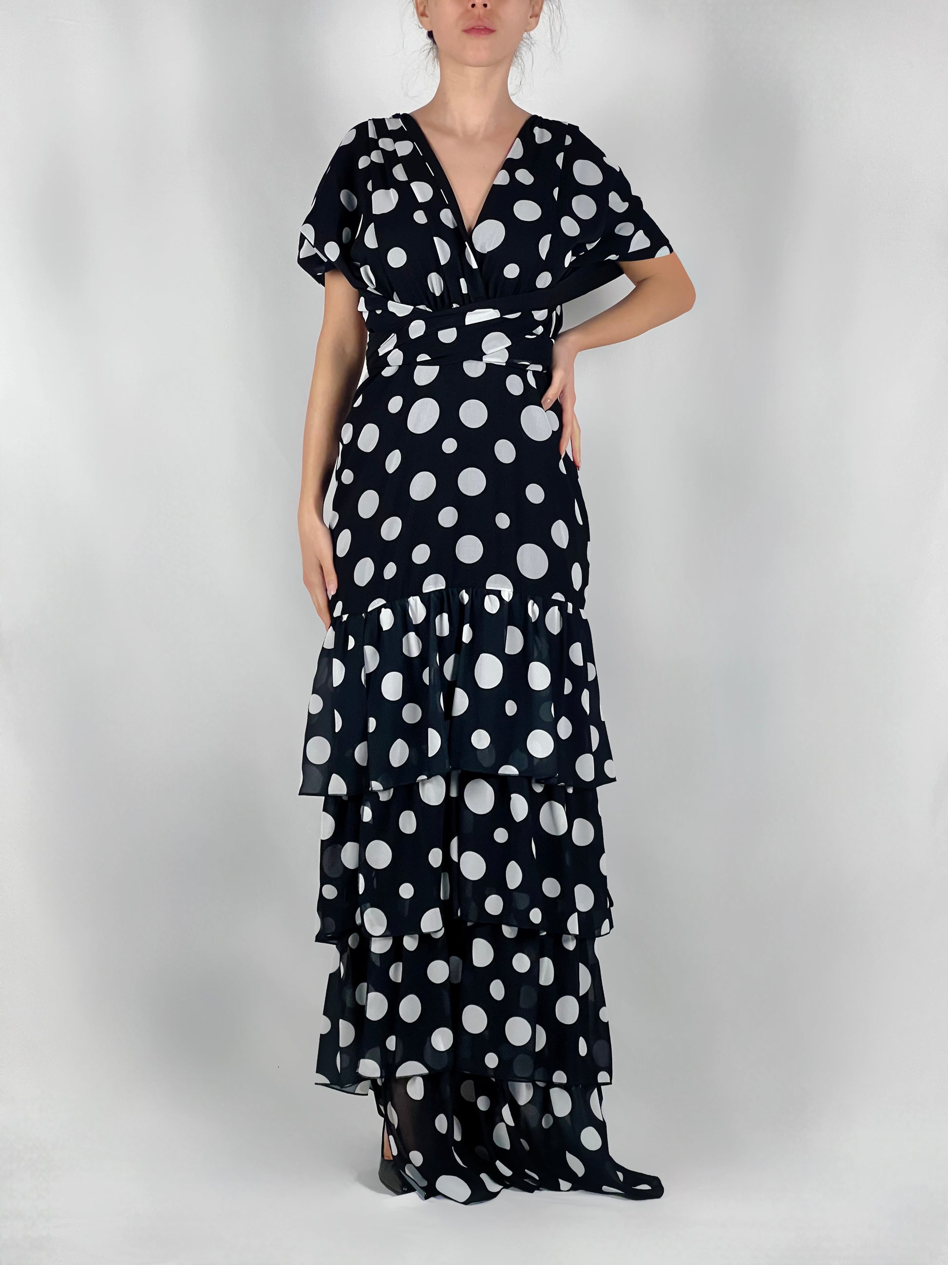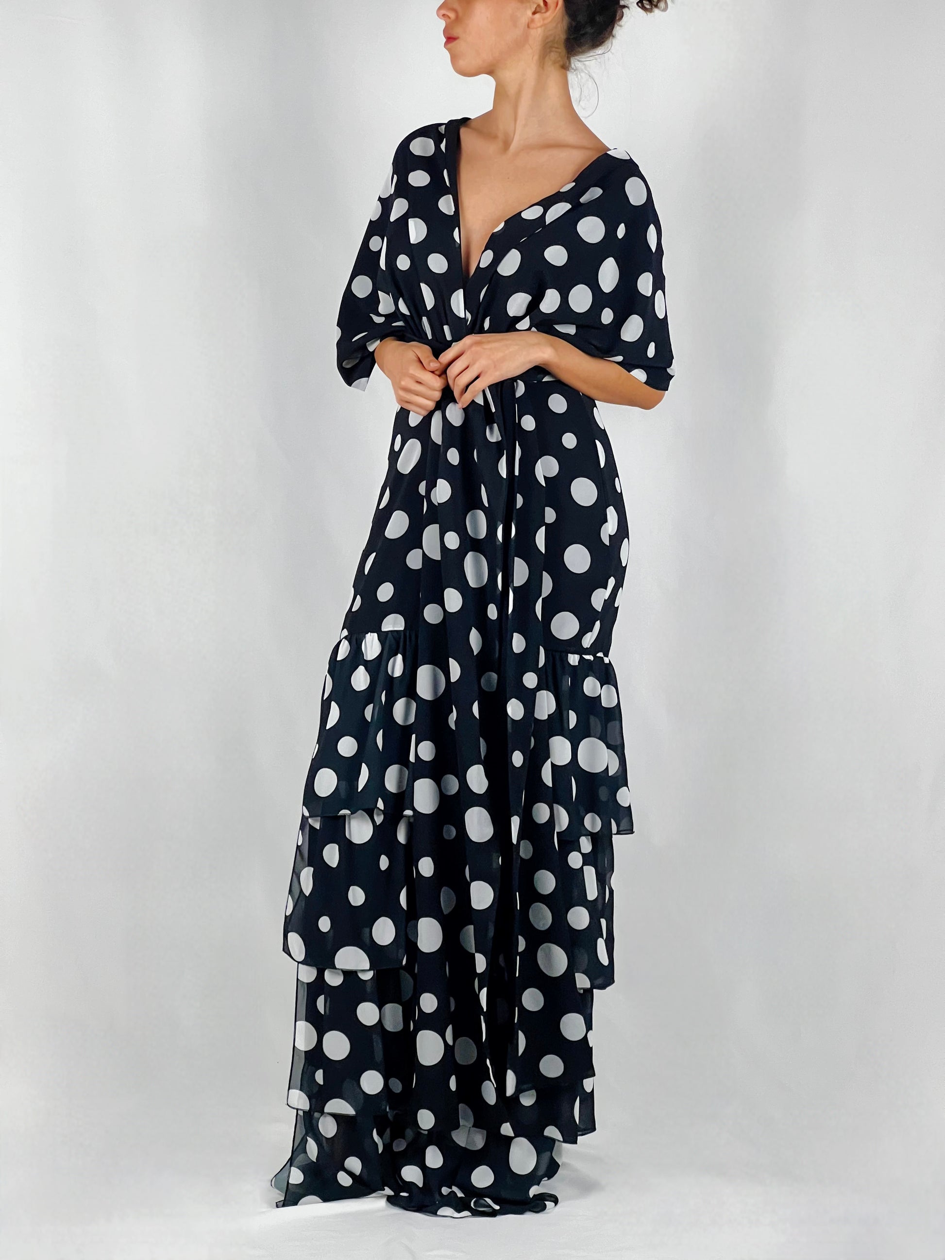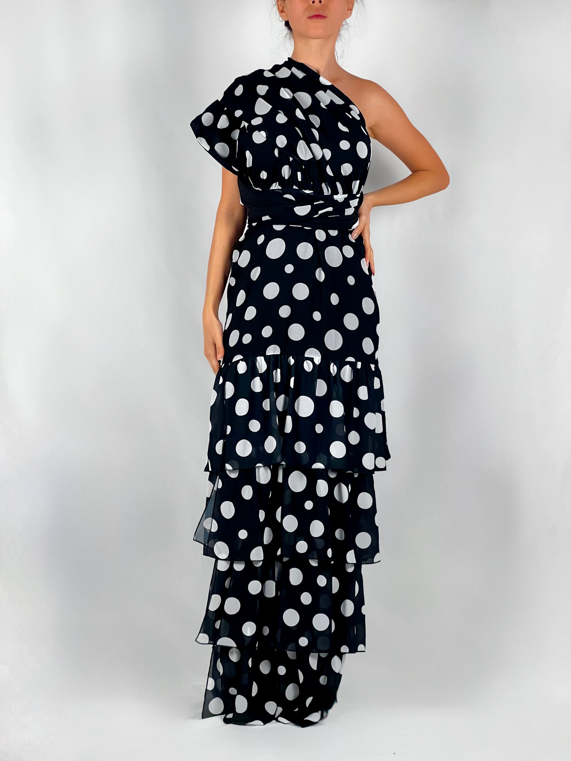 Il velato tessuto nero, arricchito da tocchi bianchi, conferisce una raffinata aura di mistero e sofisticazione.