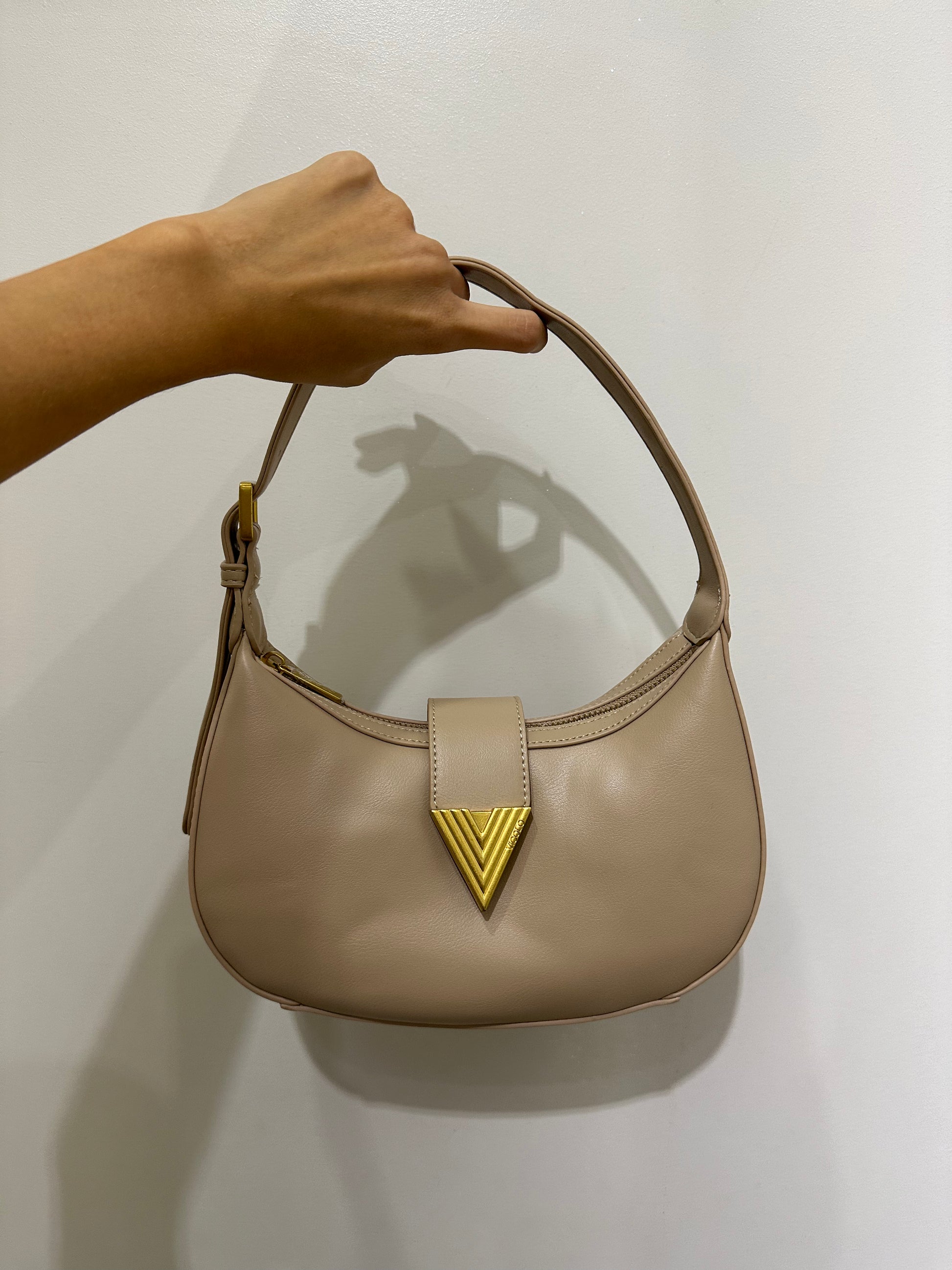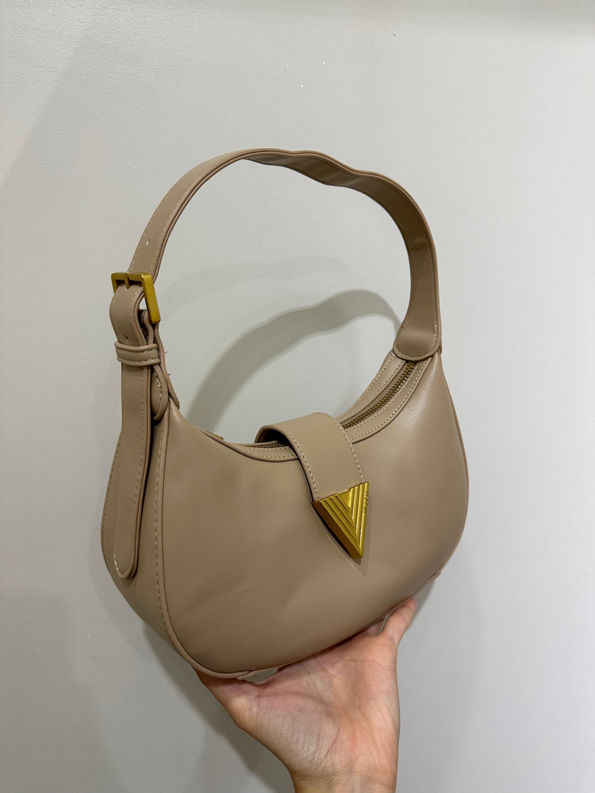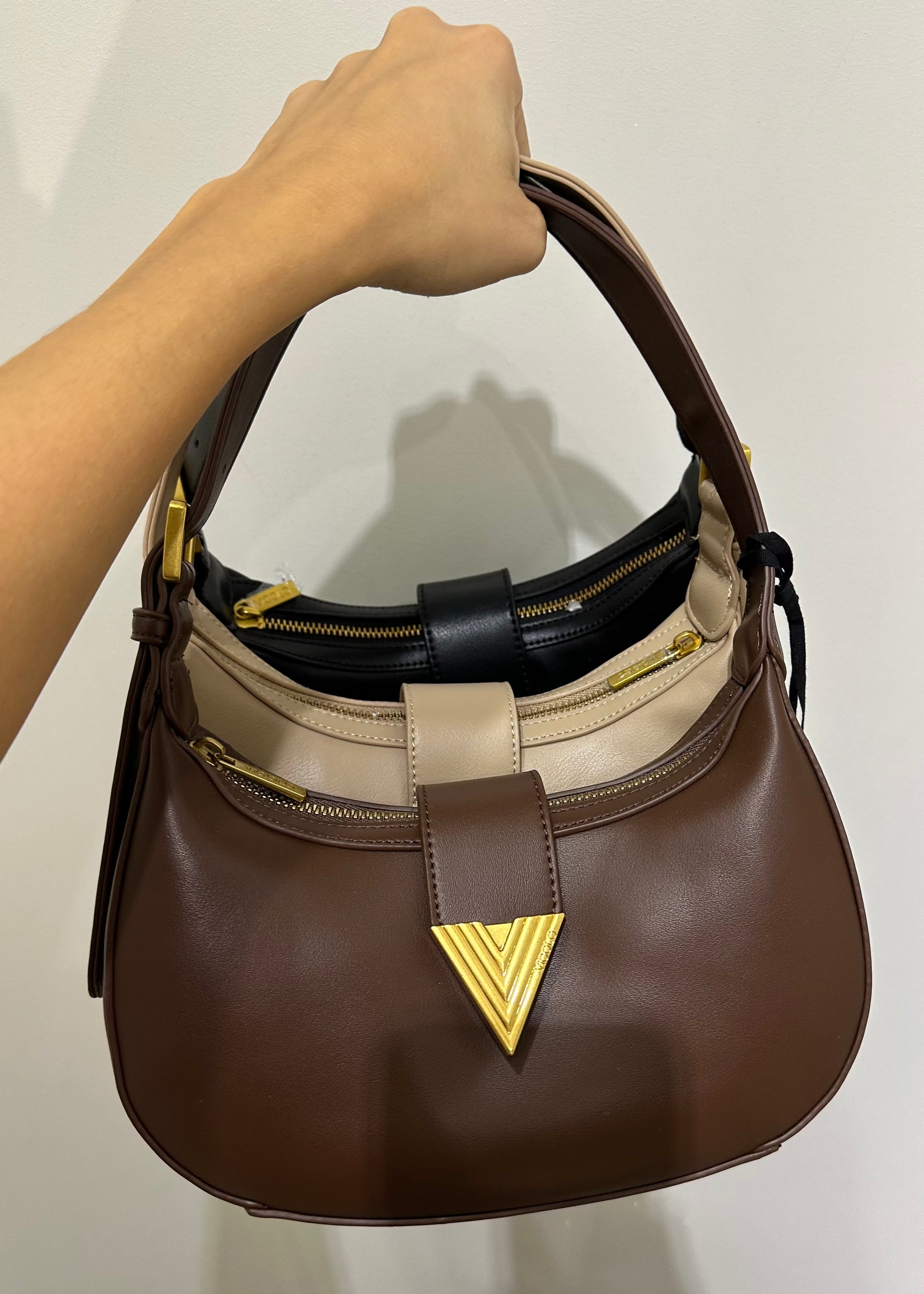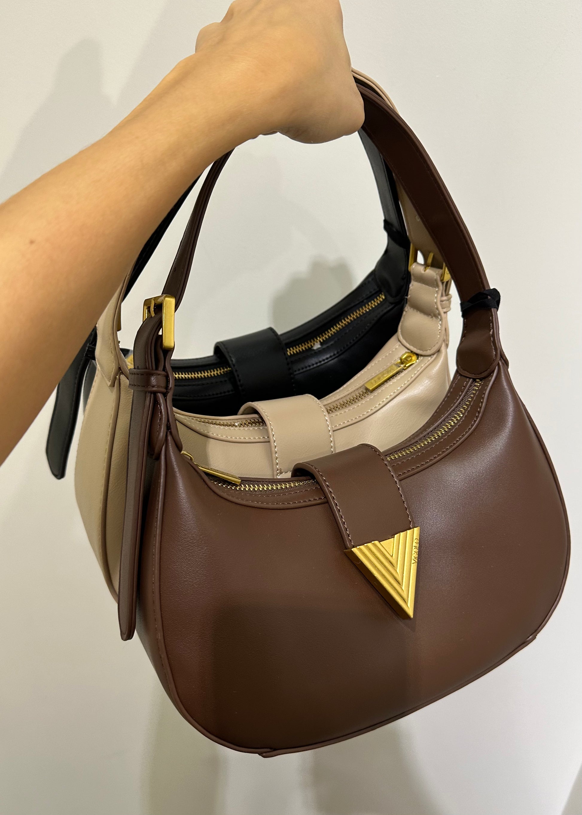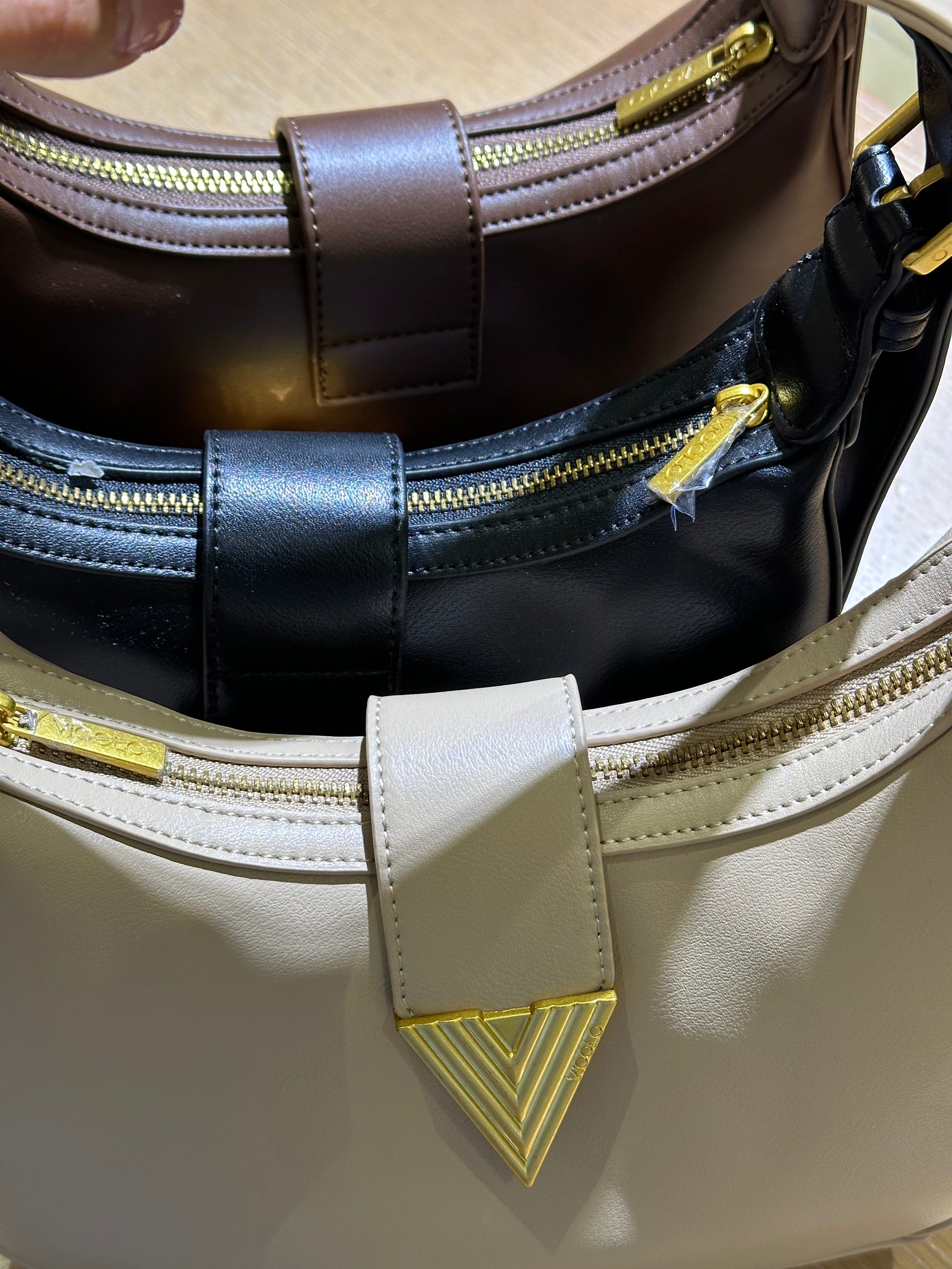 Le borse nell’immagine presentano un design arrotondato e strutturato, con una forma a mezzaluna. Hanno una chiusura con dettaglio triangolare in metallo dorato simile a quella delle borse precedenti, aggiungendo un tocco elegante e riconoscibile. La chiusura sembra essere parte di una patta che attraversa la parte superiore della borsa, e alcune di esse presentano una zip dorata visibile per una maggiore sicurezza.