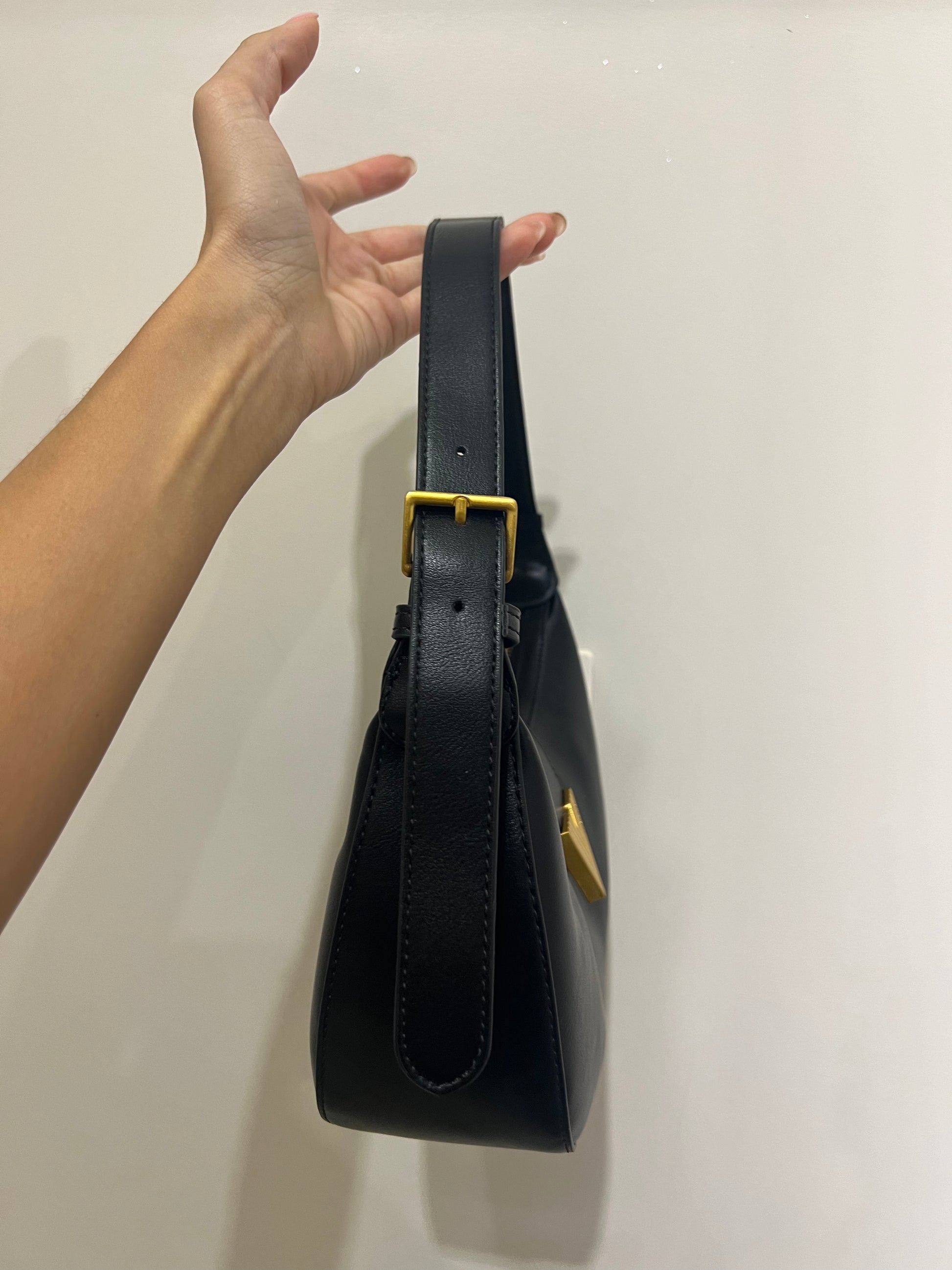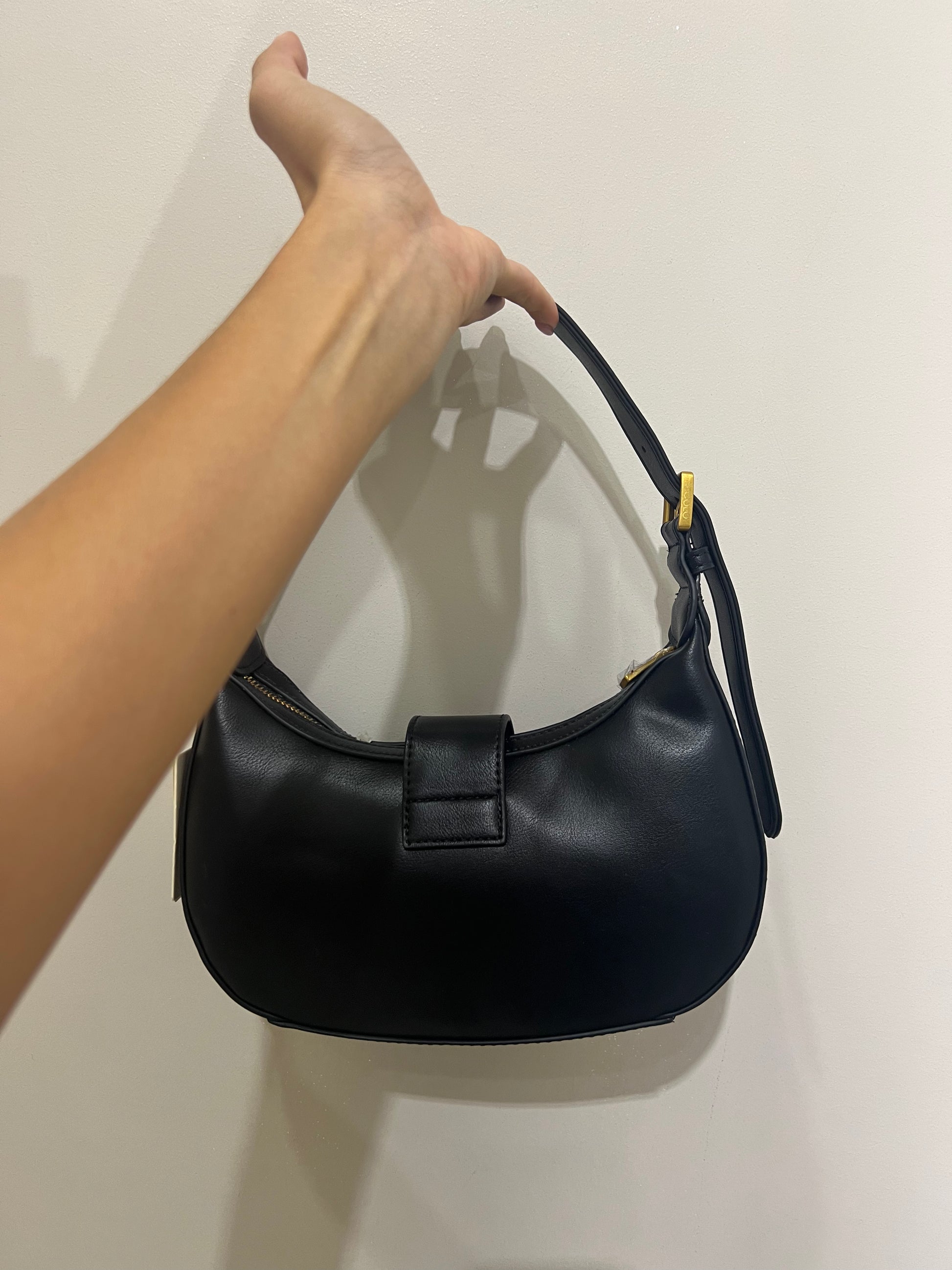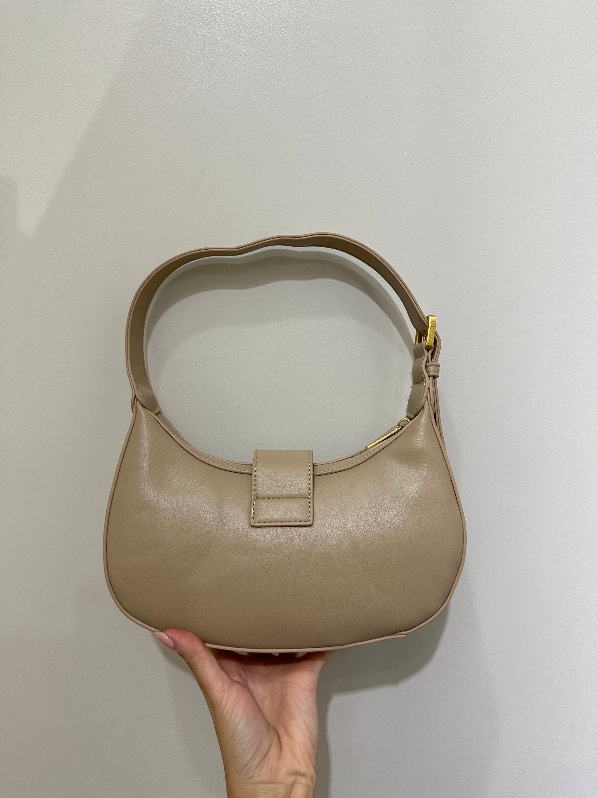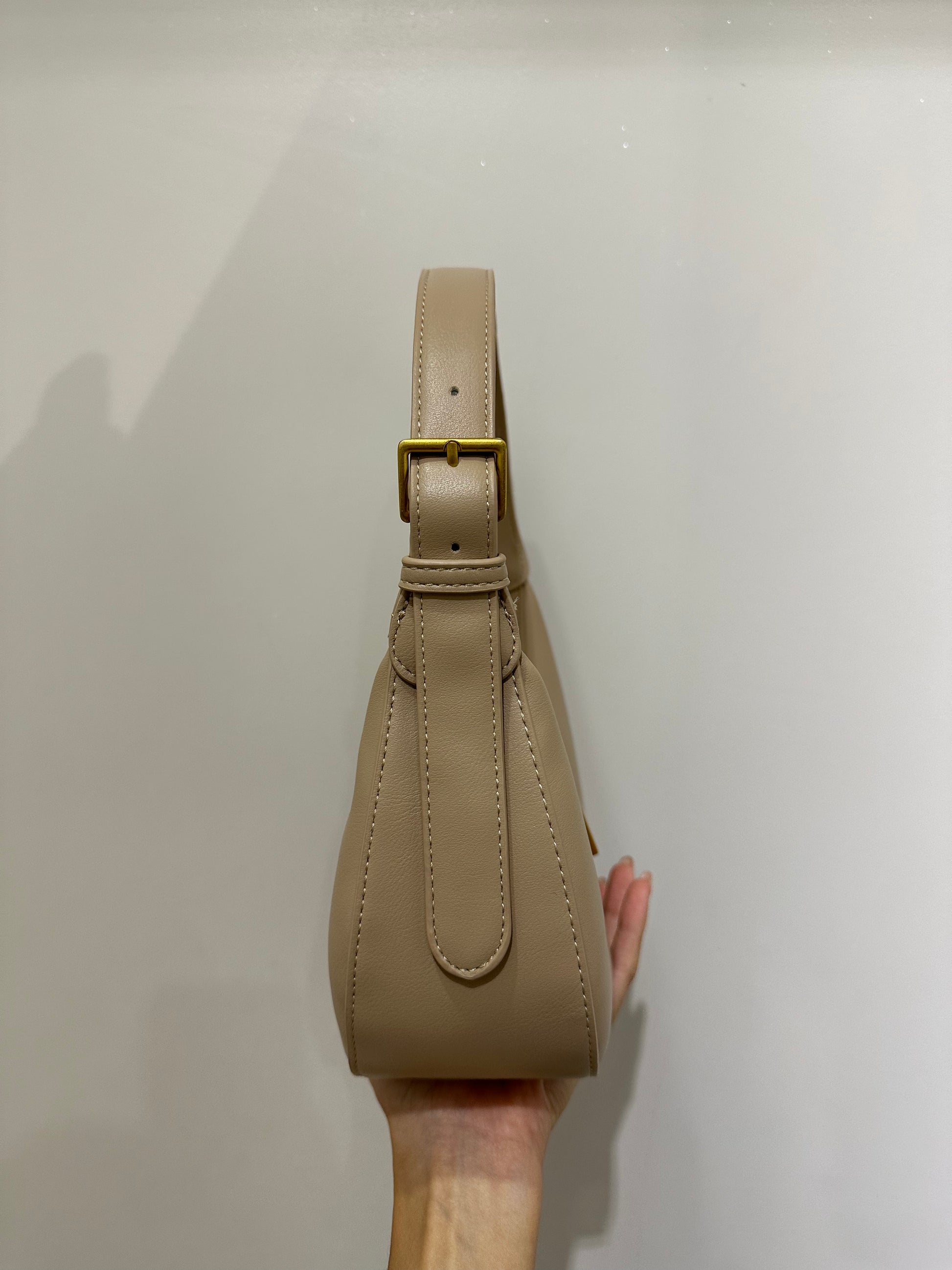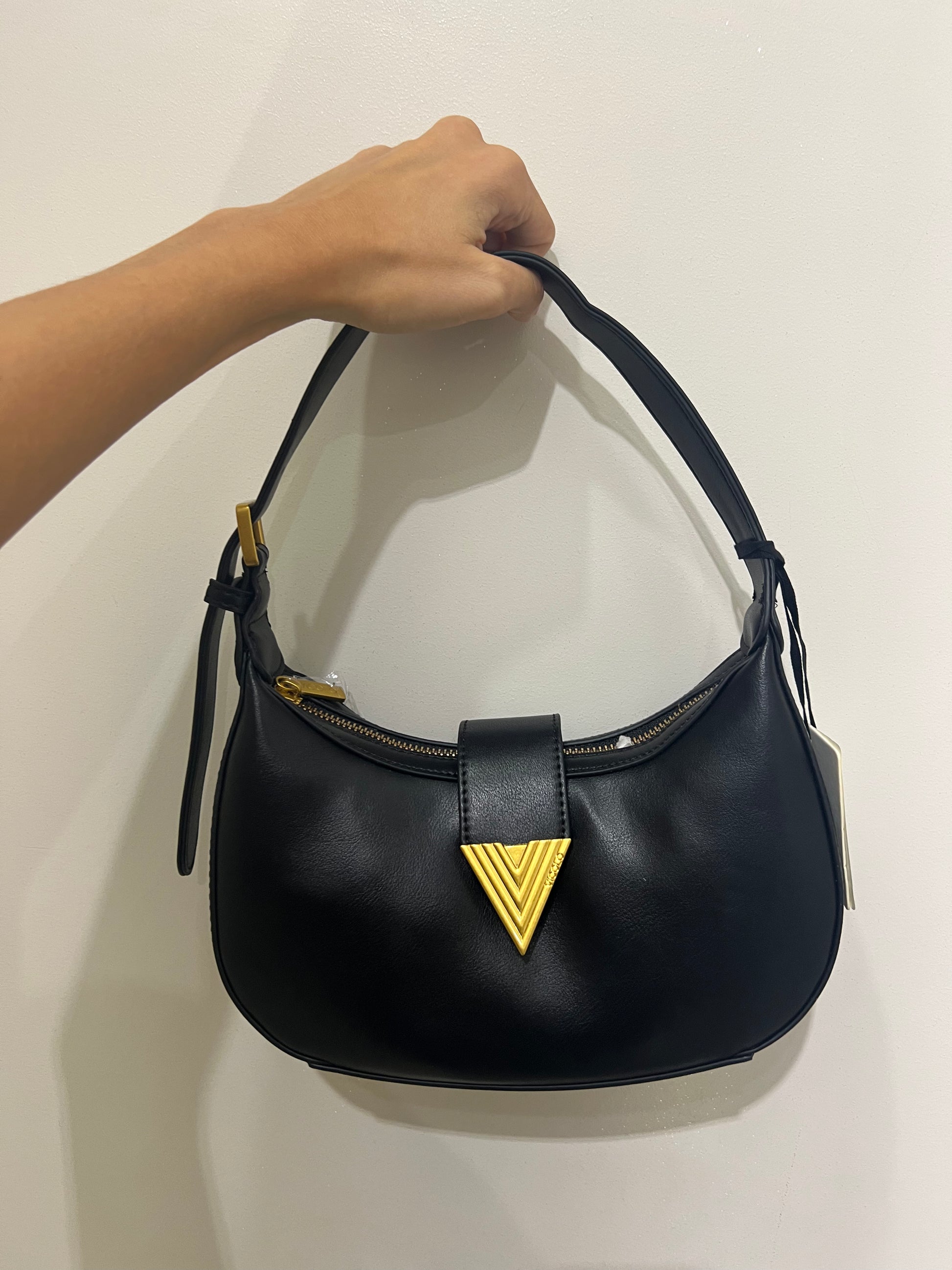 Le borse nell’immagine presentano un design arrotondato e strutturato, con una forma a mezzaluna. Hanno una chiusura con dettaglio triangolare in metallo dorato simile a quella delle borse precedenti, aggiungendo un tocco elegante e riconoscibile. La chiusura sembra essere parte di una patta che attraversa la parte superiore della borsa, e alcune di esse presentano una zip dorata visibile per una maggiore sicurezza.