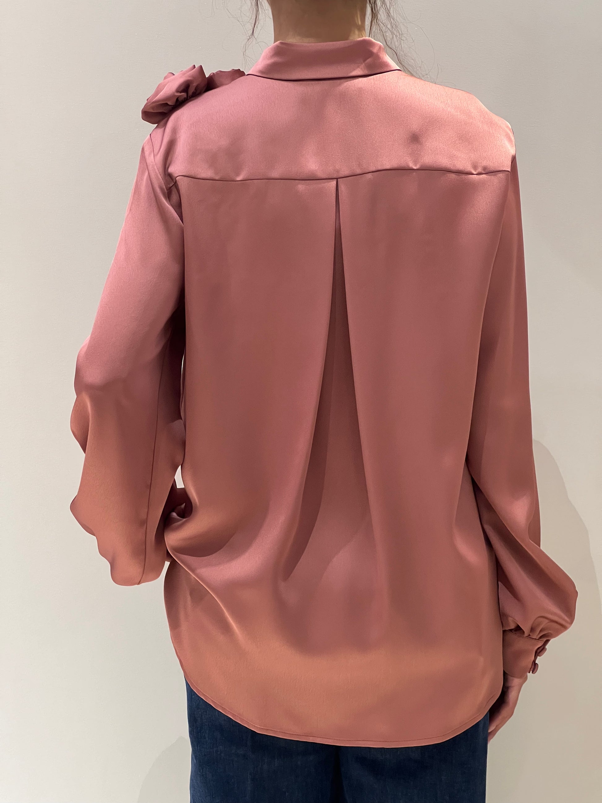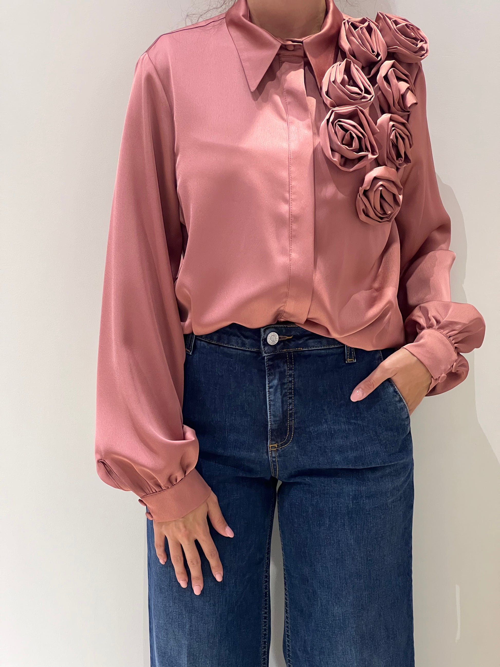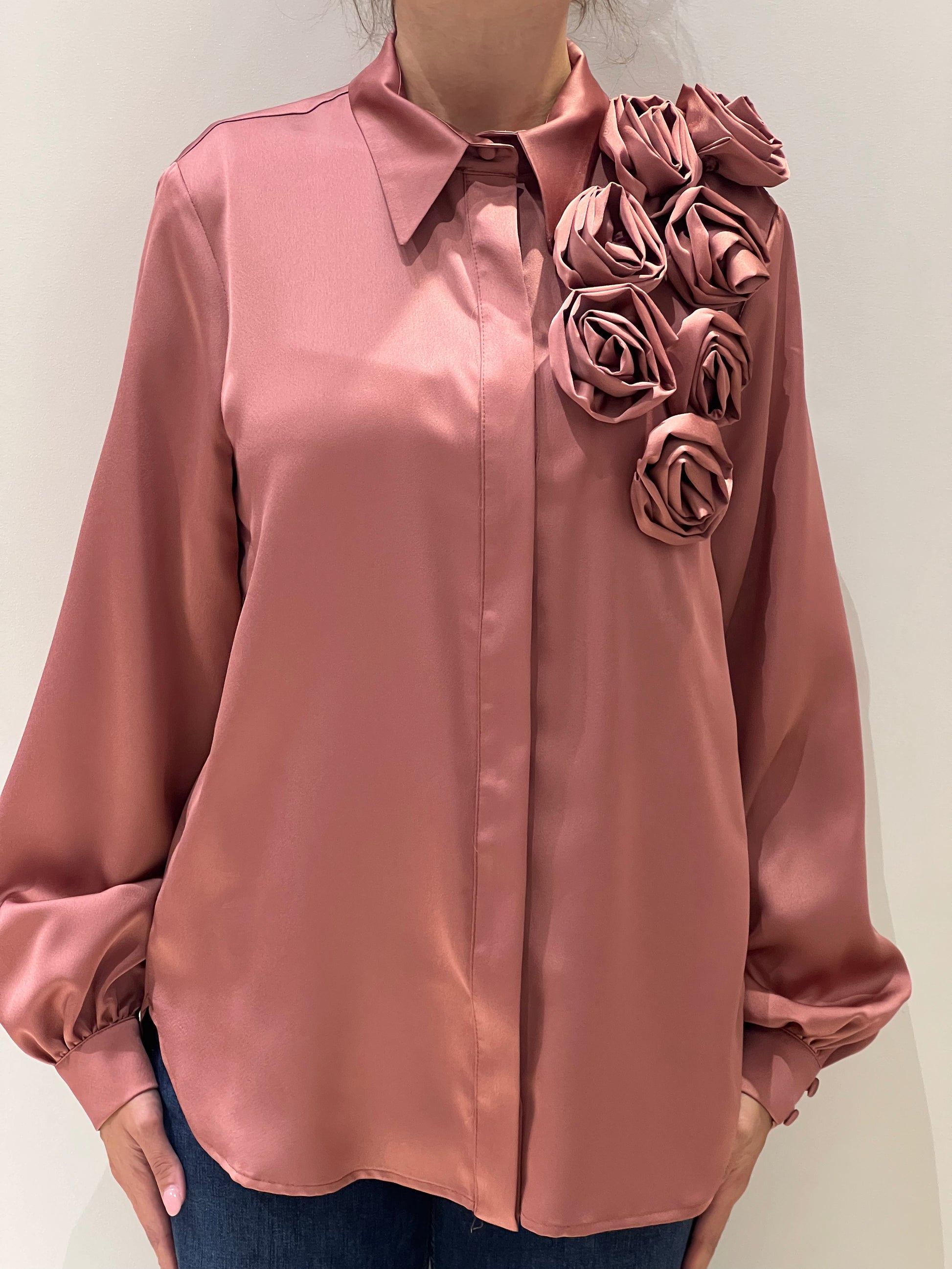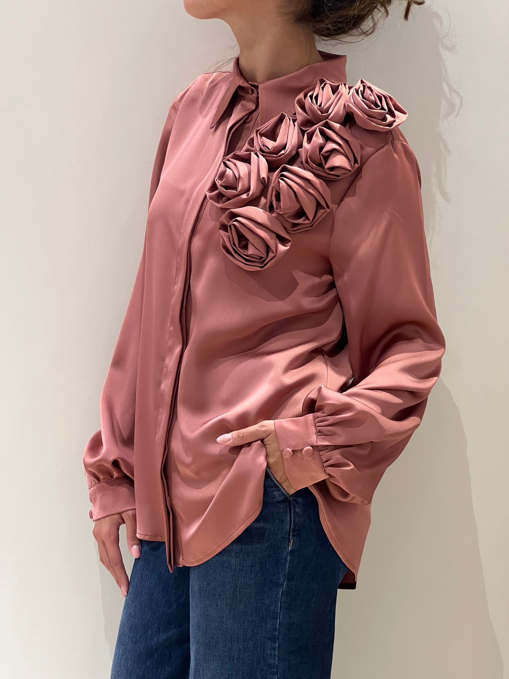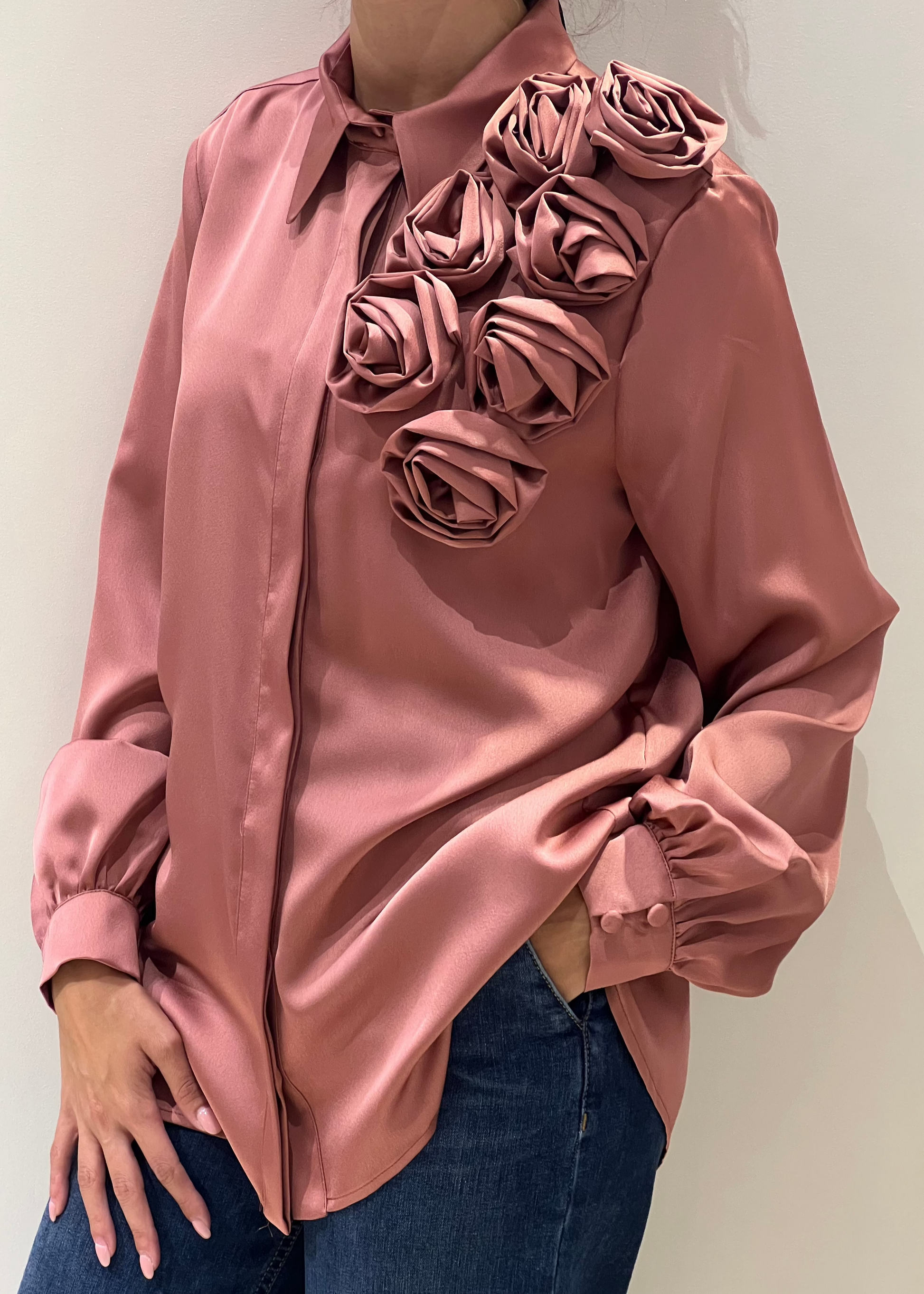Camicia in Raso Rosa con Dettaglio di Rose 3D