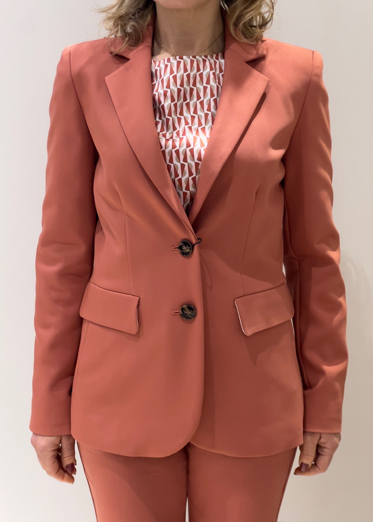 Blusa in twill bianco e mattone (ruggine), scollo tondo, maniche lunghe con polsino, linea dritta morbida, fondo stondato, la modella indossa una tg.40, la modella ha le seguenti misure: altezza 168, seno 86, vita 65, fianchi 93,