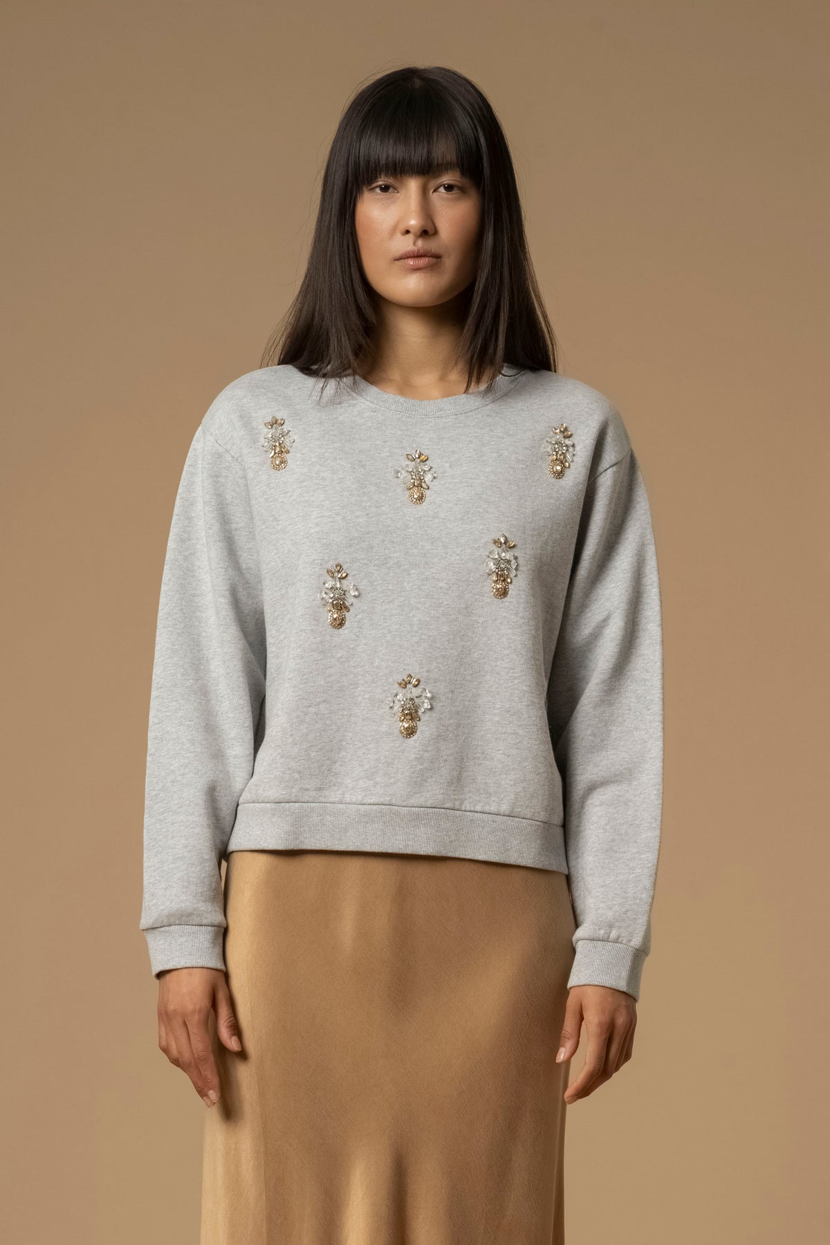 Stile casual chic per questa felpa della capsule Pure Verve caratterizzata dal dettaglio in perle e strass sul davanti. Questo modello presenta scollo rotondo, taglio dritto e bordi a costine.