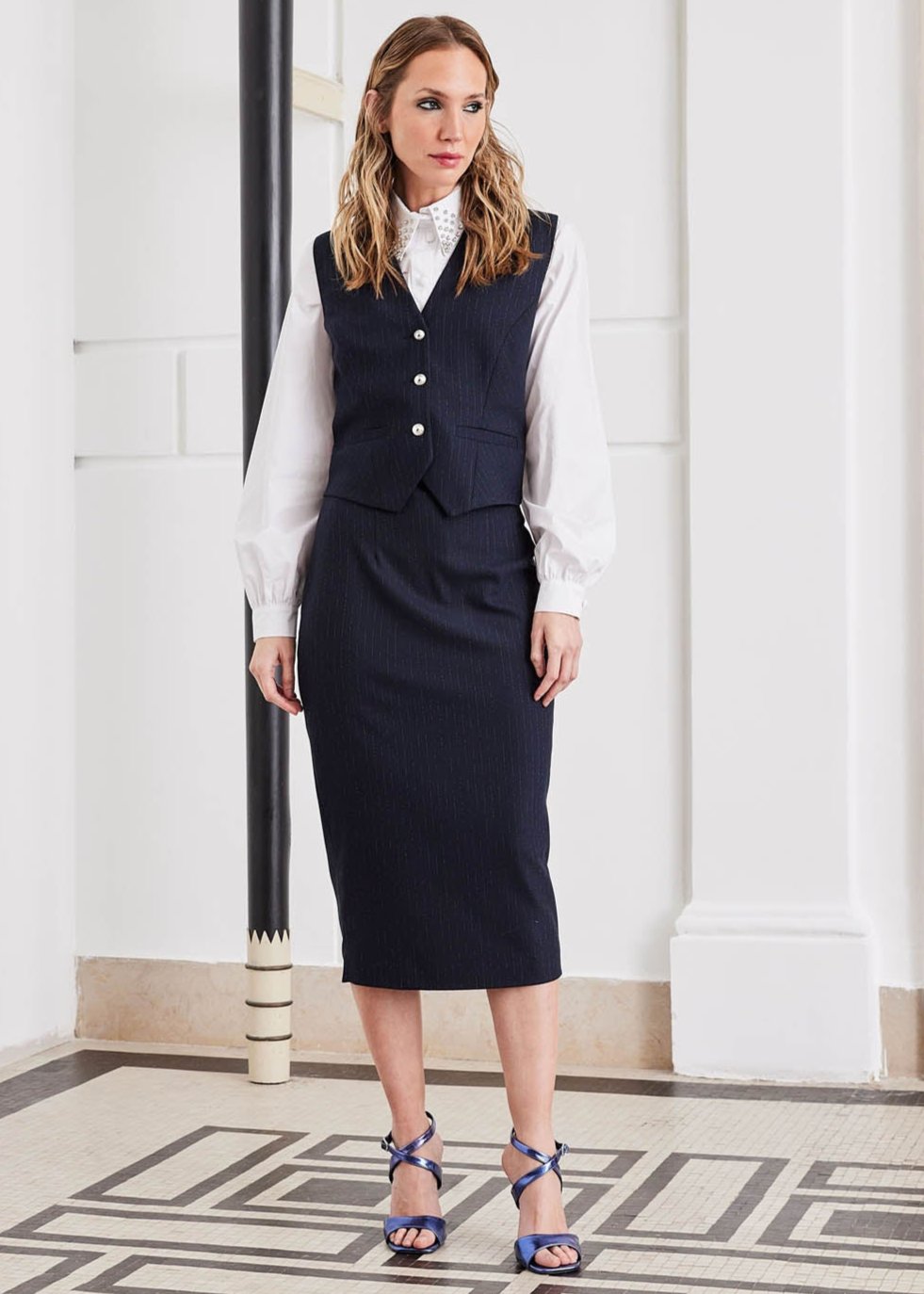 La gonna blu gessata lunghette è un capo raffinato che unisce eleganza e praticità. Realizzata in un tessuto blu scuro con sottili righe gessate verticali, slancia visivamente la figura grazie al suo taglio a vita alta e alla lunghezza che si ferma sotto il ginocchio. La linea aderente segue delicatamente le forme, mentre il design classico del gessato dona un tocco professionale e senza tempo. Perfetta per look formali o da ufficio, può essere abbinata alla camicia o al suo gilet per un outfit impeccabile e di classe.