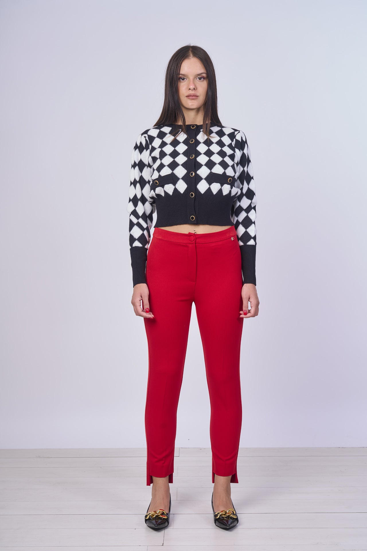 Realizzato con un filato morbido, il cardigan presenta un motivo a quadri o losanghe che attira immediatamente l’attenzione. Le maniche a sbuffo aggiungono un tocco di volume e modernità, mentre i bottoni dorati a pressione, che percorrono tutta la parte anteriore, creano un contrasto elegante con il tessuto bicolore.