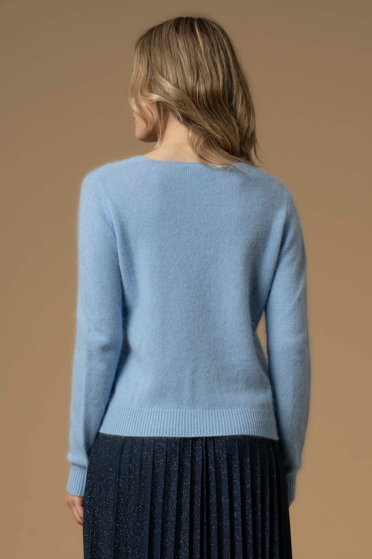 Questa maglia, caratterizzata da uno stile minimal e un taglio essenziale, è impreziosita da un delicato dettaglio in pietre sullo scollo a V. Il capo presenta bordi a costine e vestibilità regolare.
