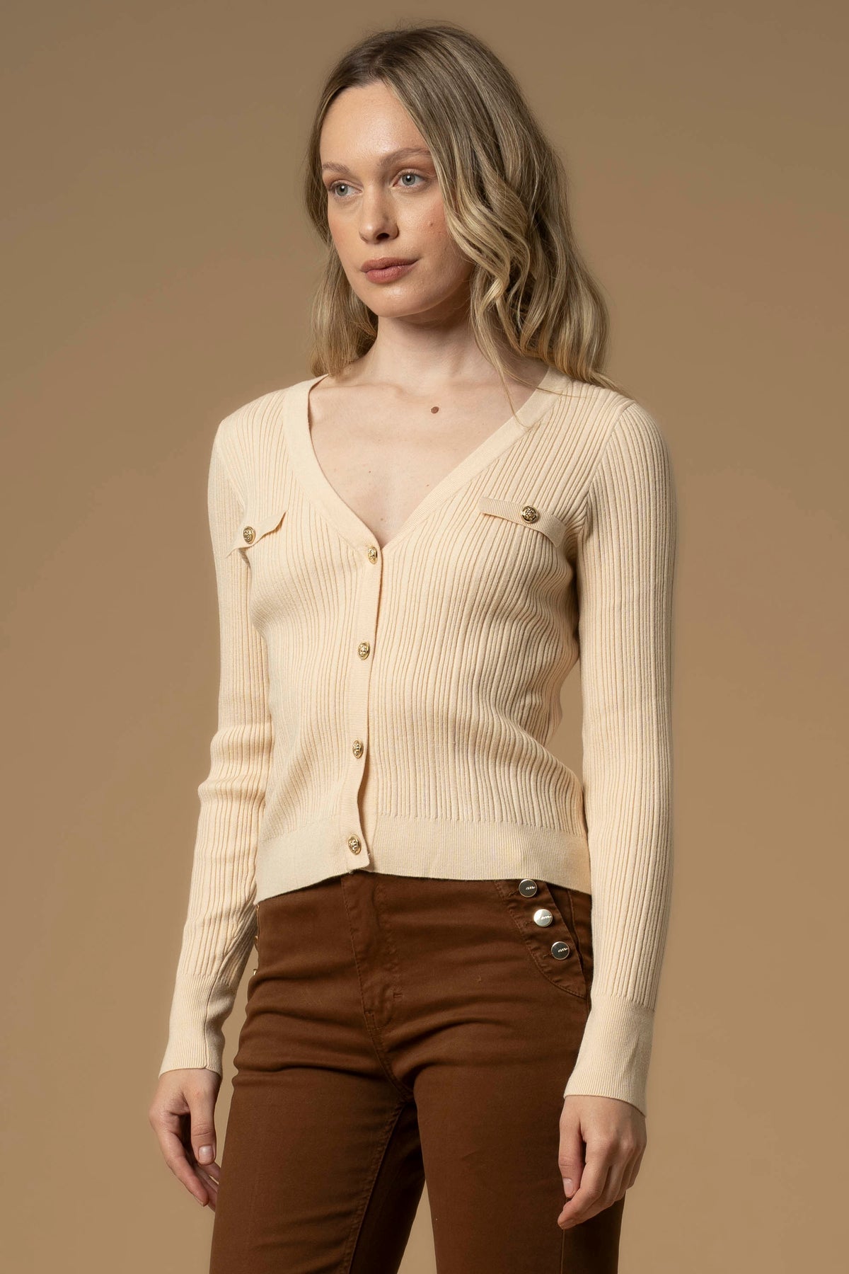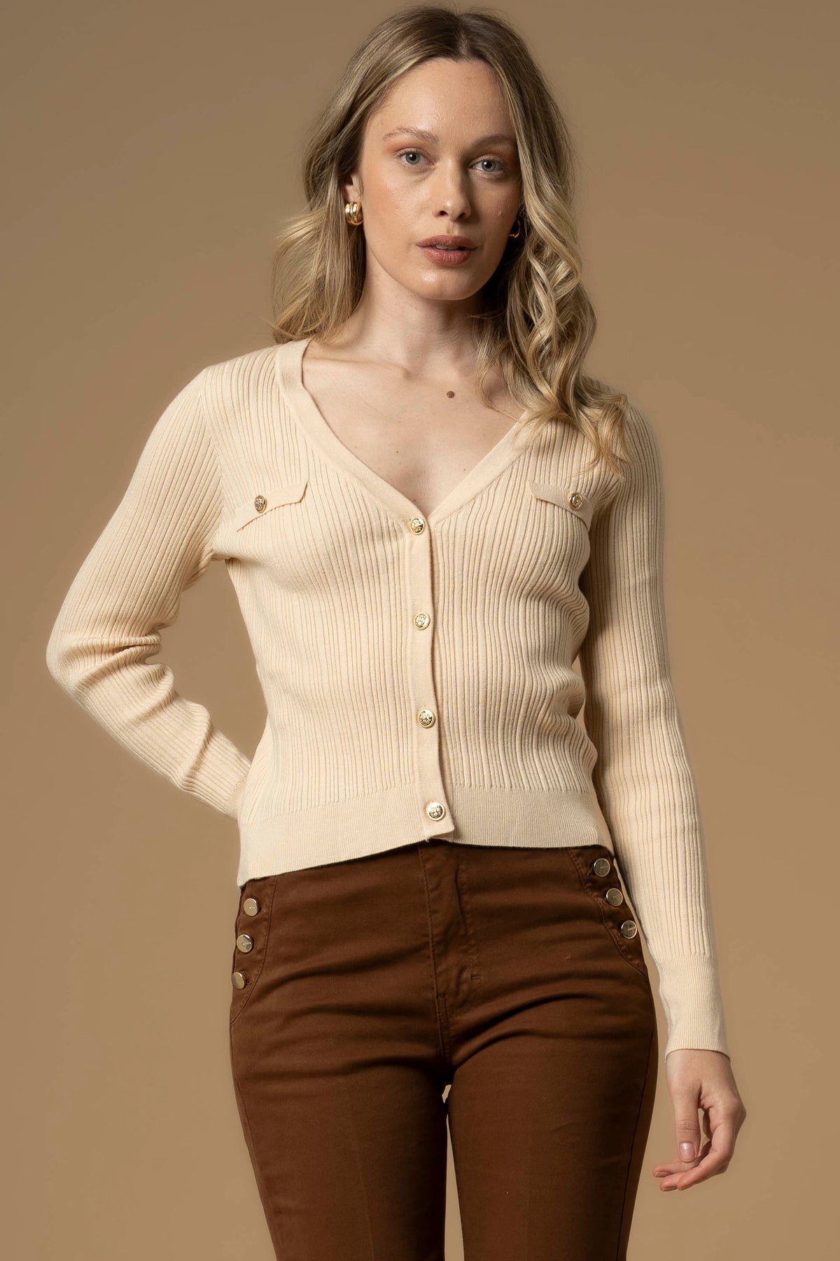 Il taglio essenziale di questa maglia è impreziosito da una delicata lavorazione all over a costine. Il capo presenta finte tasche con bottone dorato sul davanti, vestibilità aderente e chiusura frontale con bottoni.