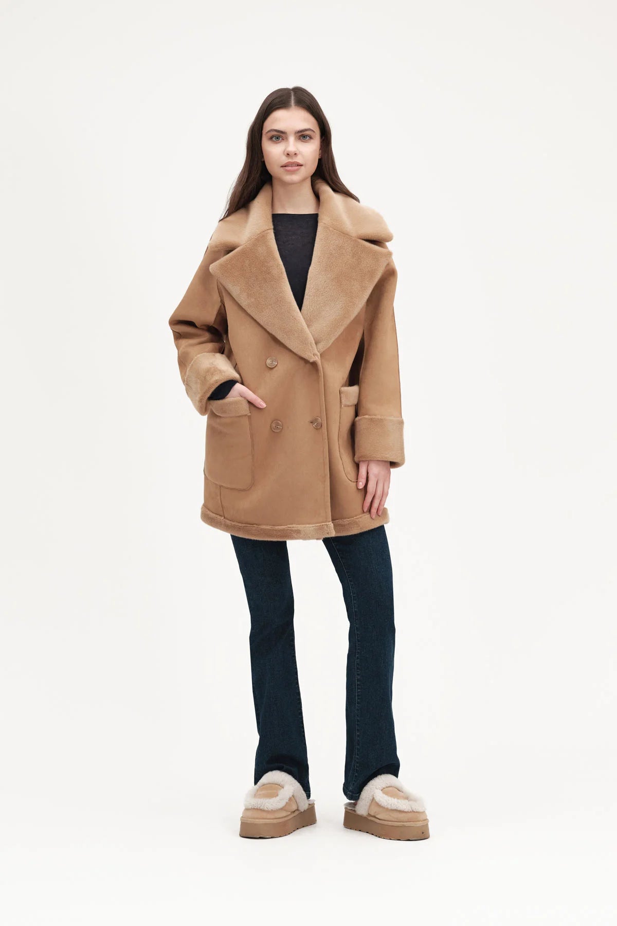 Questo elegante cappotto doppiopetto in montone beige rappresenta un capo essenziale per la stagione fredda. Realizzato con lana di qualità superiore, offre isolamento termico eccezionale mantenendo una silhouette raffinata e senza volume eccessivo. La chiusura doppiopetto conferisce un'allure sofisticata, mentre la tonalità beige neutro si abbina facilmente con qualsiasi guardaroba. Perfetto per chi ricerca un equilibrio tra comfort, durabilità e stile classico intramontabile.