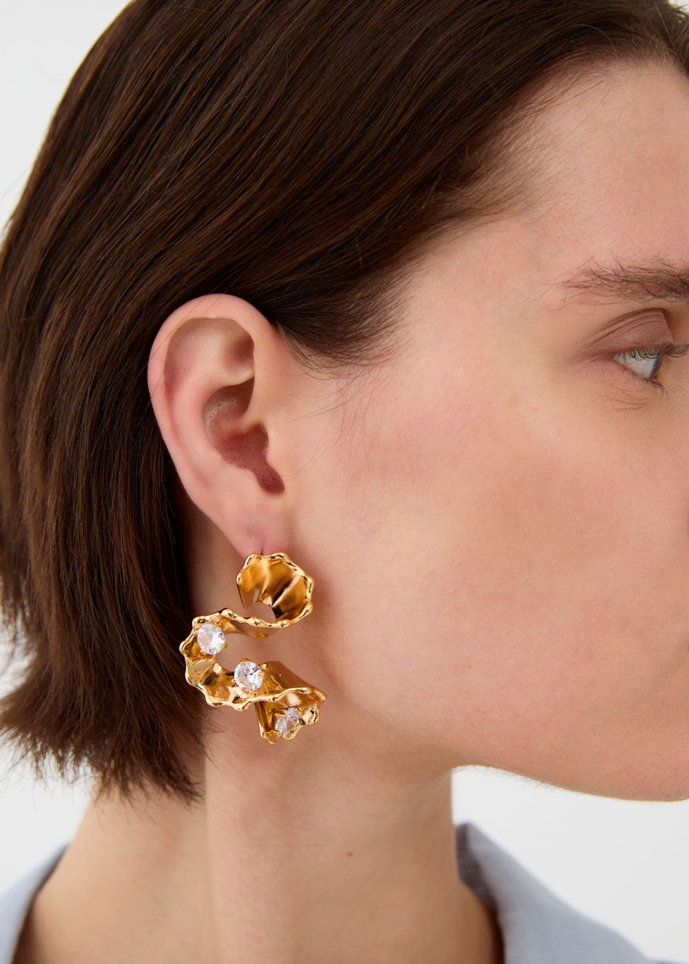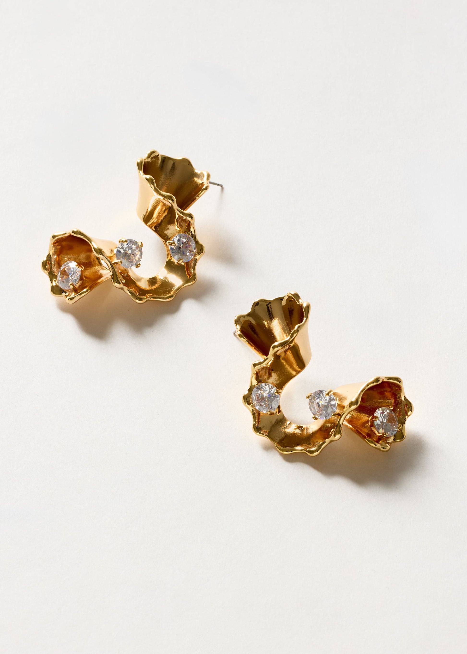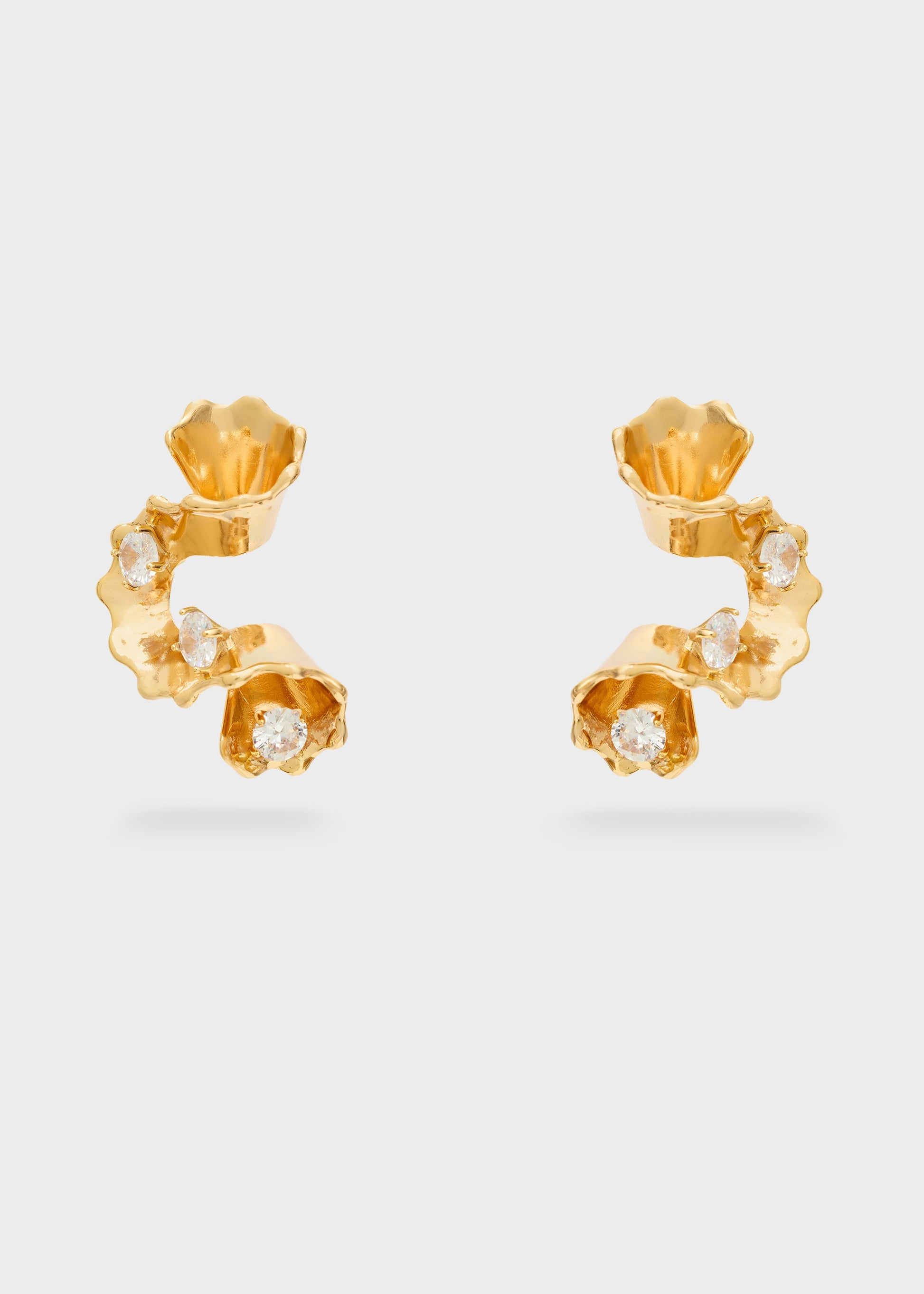 Orecchini a lobo con elementi floreali scolpiti e dettagli centrali luminosi. Il design elaborato ma armonioso richiama un’eleganza ricercata, ideale per chi desidera un accessorio femminile e distintivo.