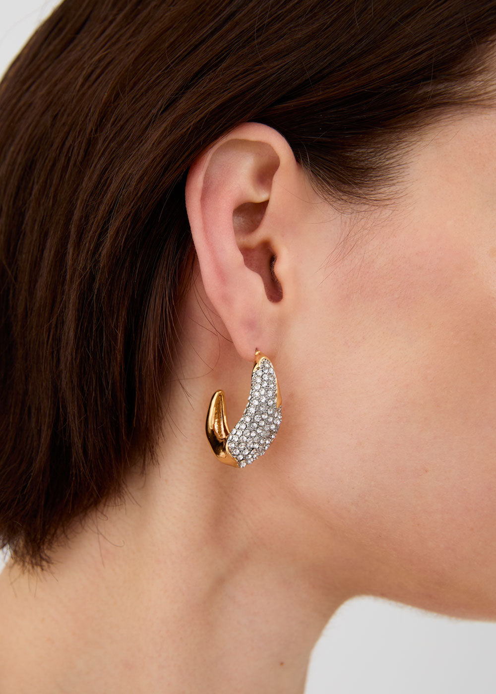 Orecchini a lobo dalla forma avvolgente con superficie interamente decorata. Il design compatto e brillante dona luce al viso ed è perfetto per completare look sofisticati con un tocco deciso e glamour.