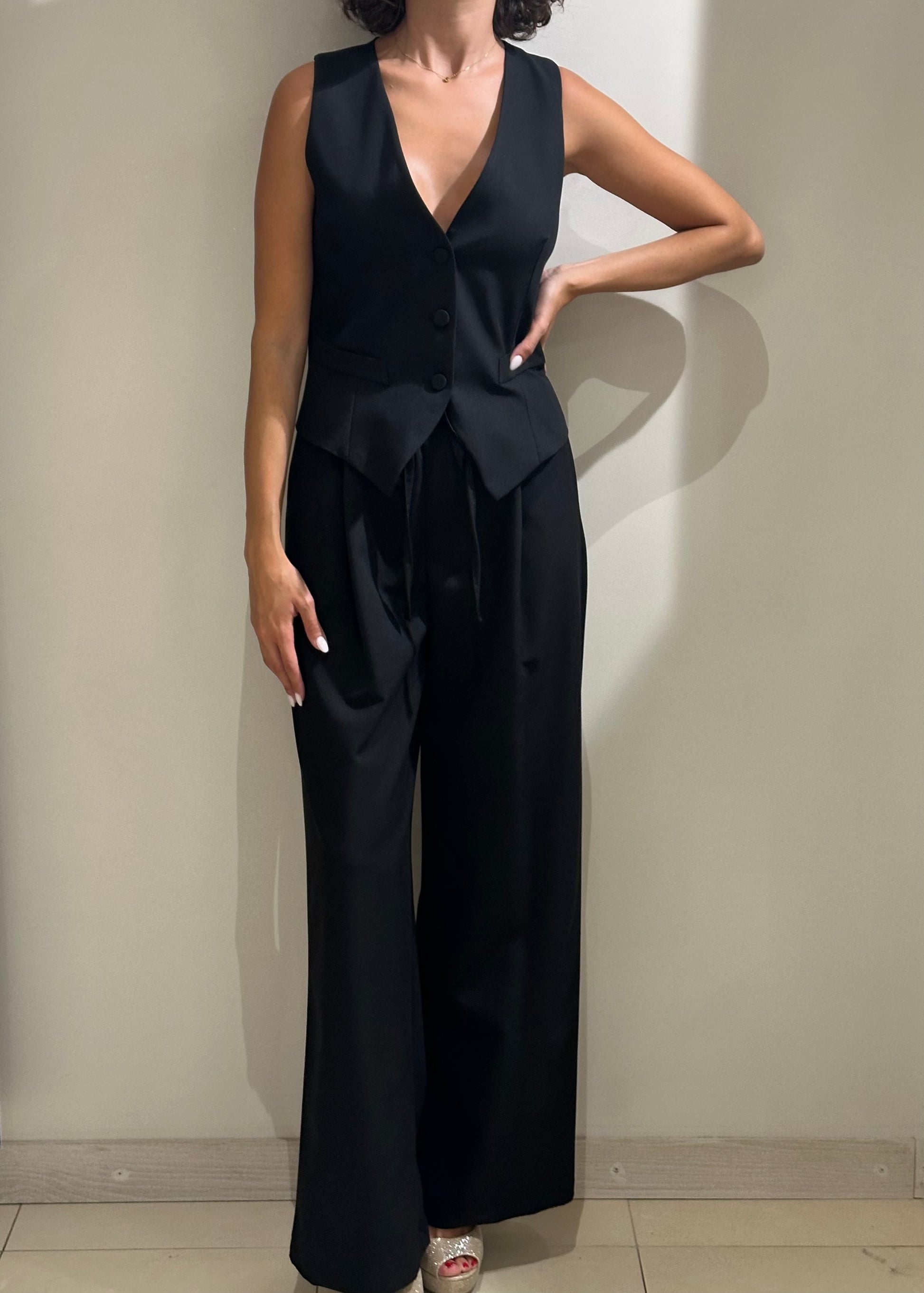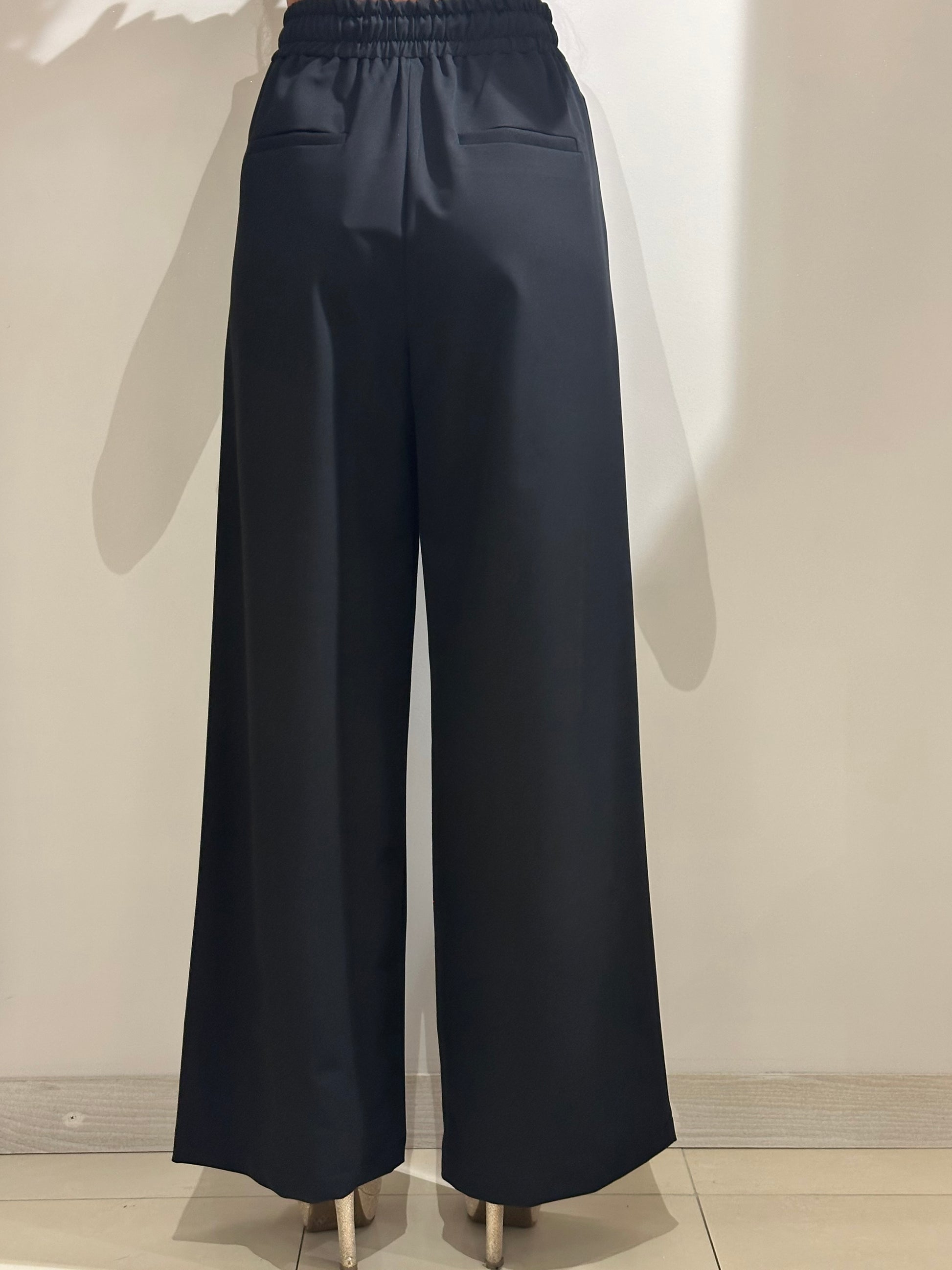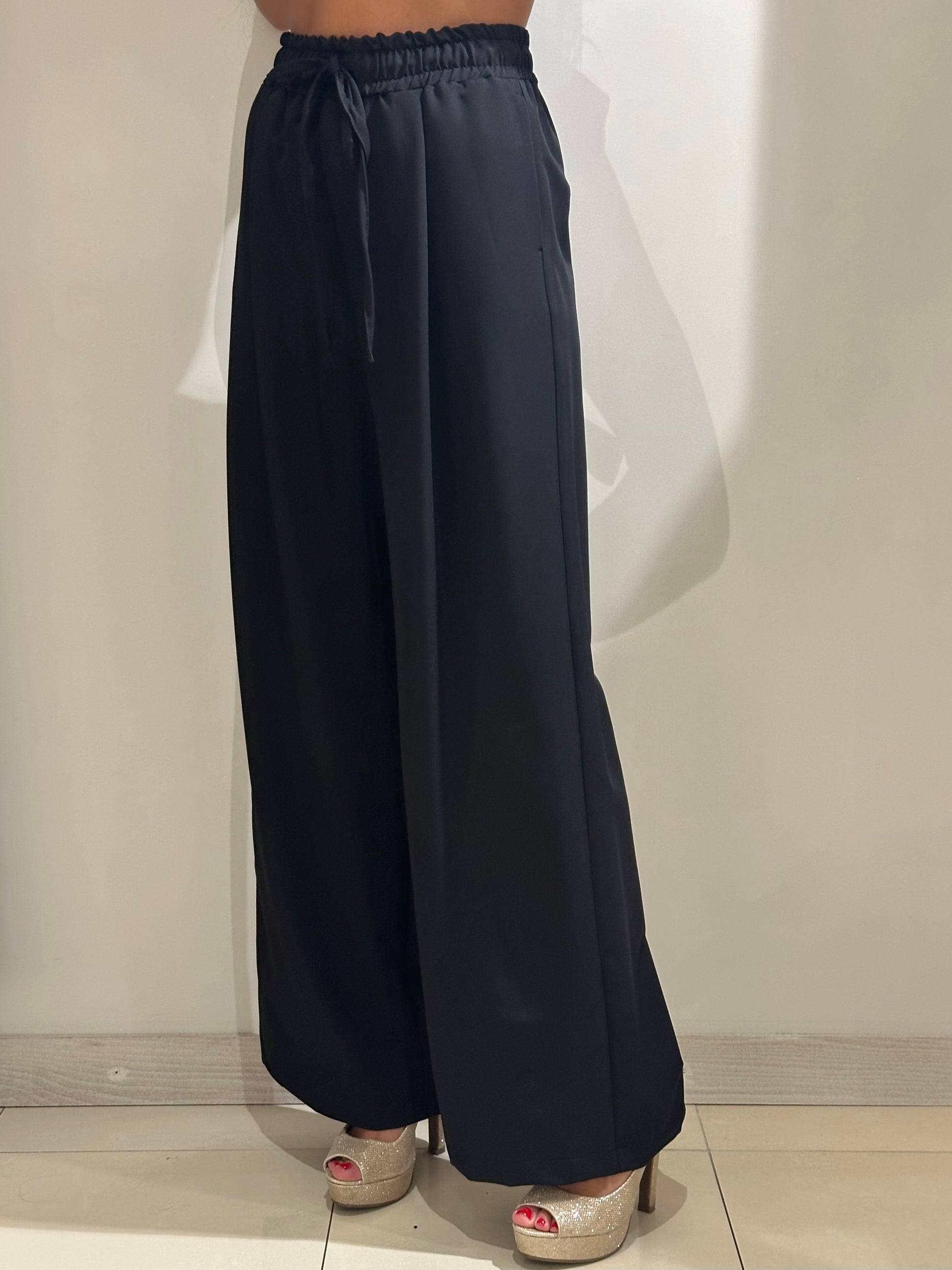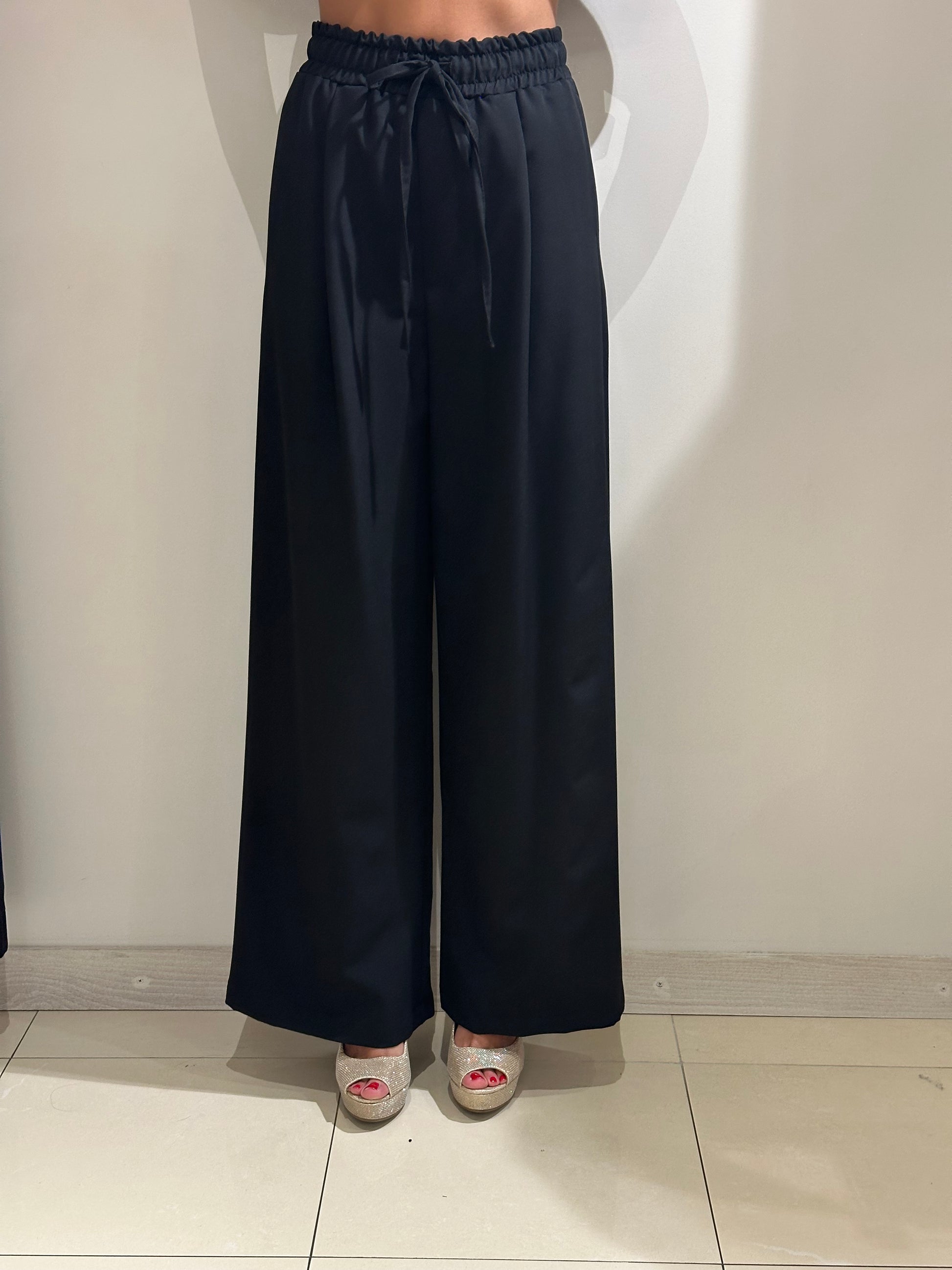 Pantalone ampio con coulisse. Dettaglio Coulisse e laccio in vita. Tasche laterali alla francese.