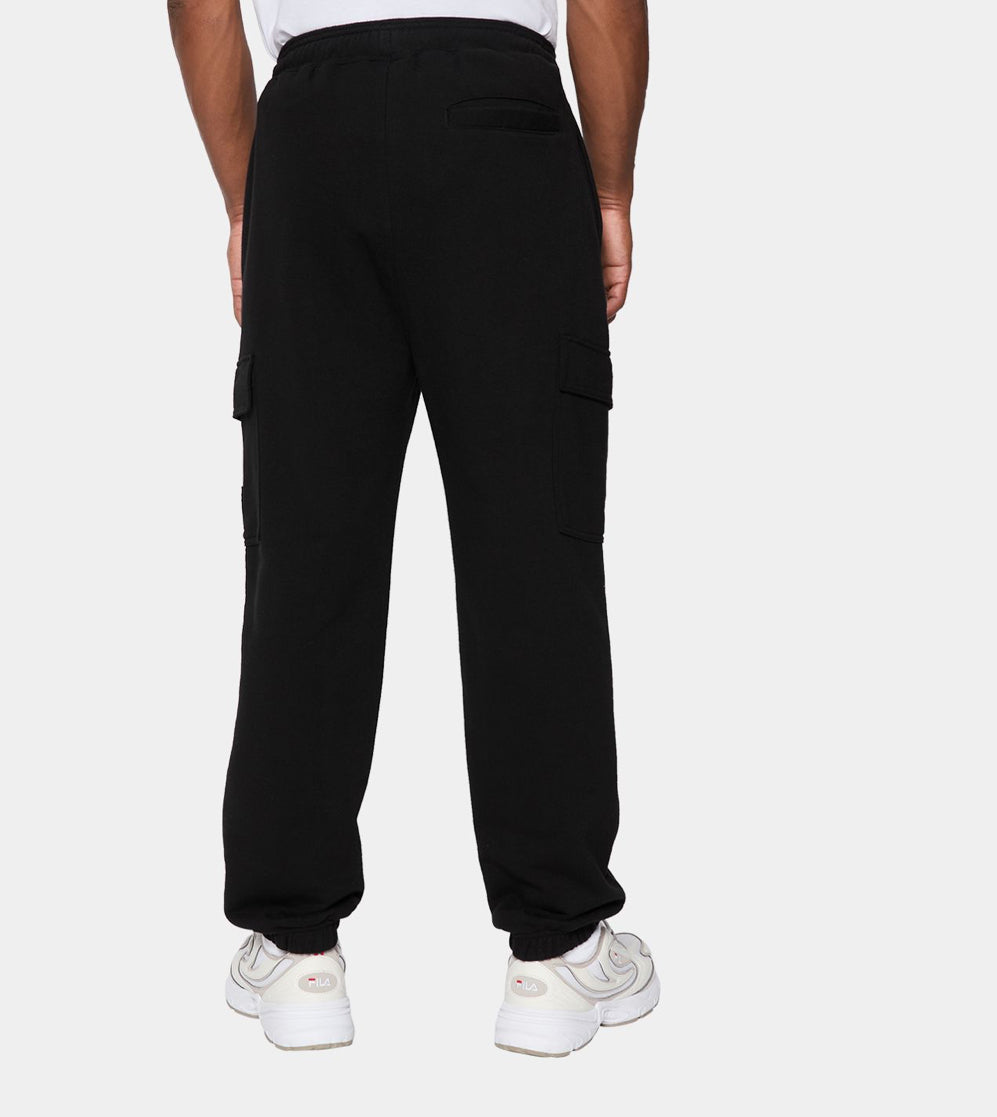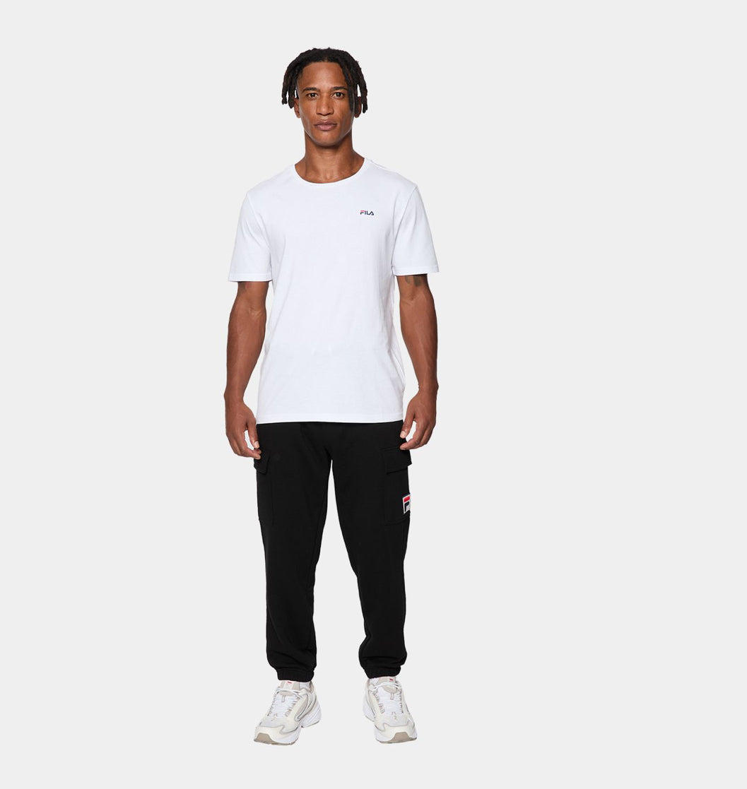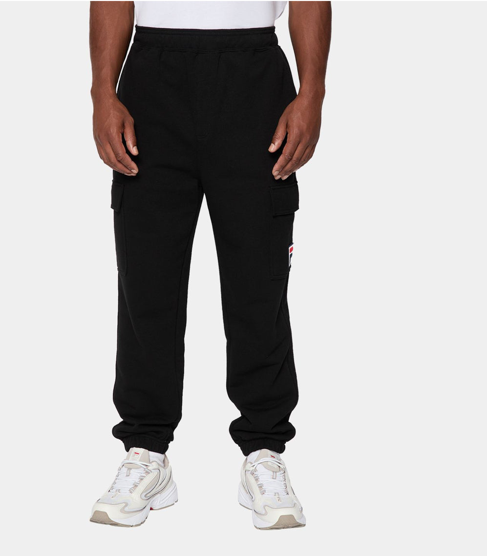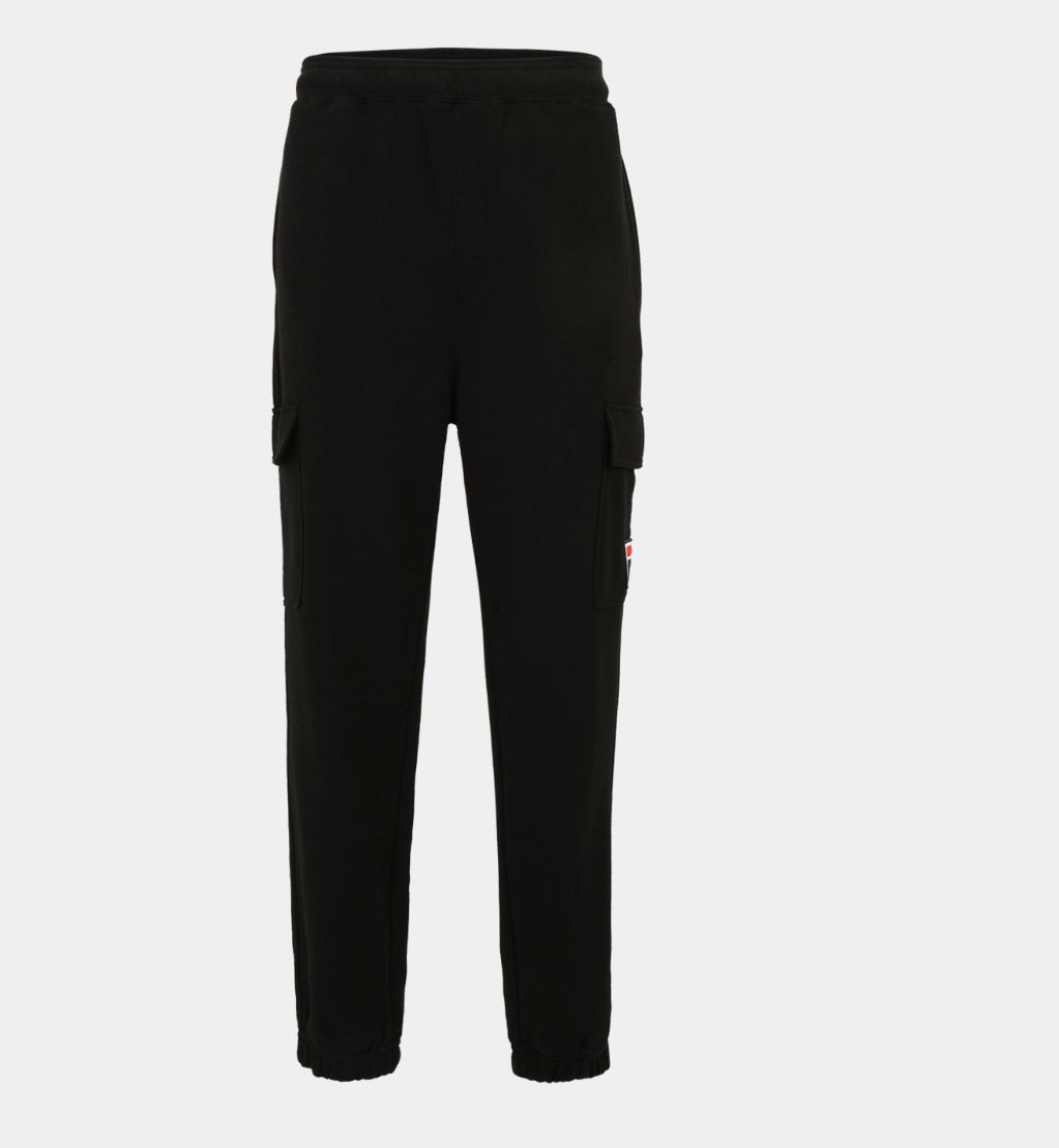 Pantalone cargo in felpa nero, caratterizzato da un design funzionale e confortevole. Presenta ampi tasconi laterali, ideali per un look casual e pratico. Realizzato in morbido cotone misto, offre una vestibilità regolare e una libertà di movimento ottimale, grazie al tessuto elasticizzato in vita con coulisse regolabile. I dettagli Fila aggiungono un tocco sportivo e di tendenza.