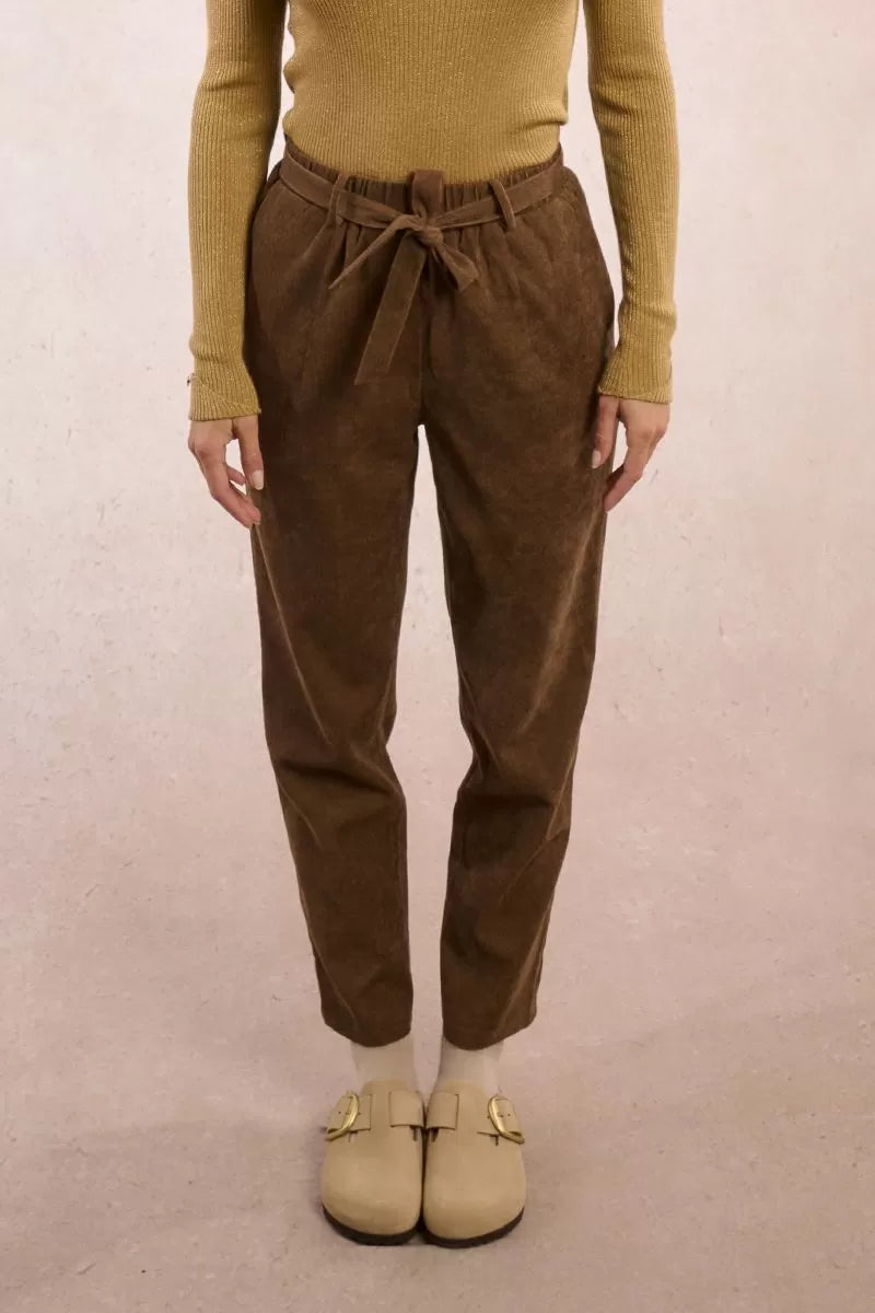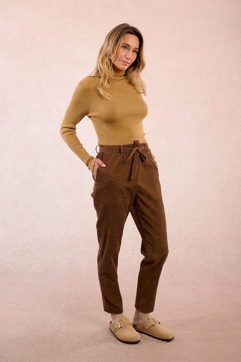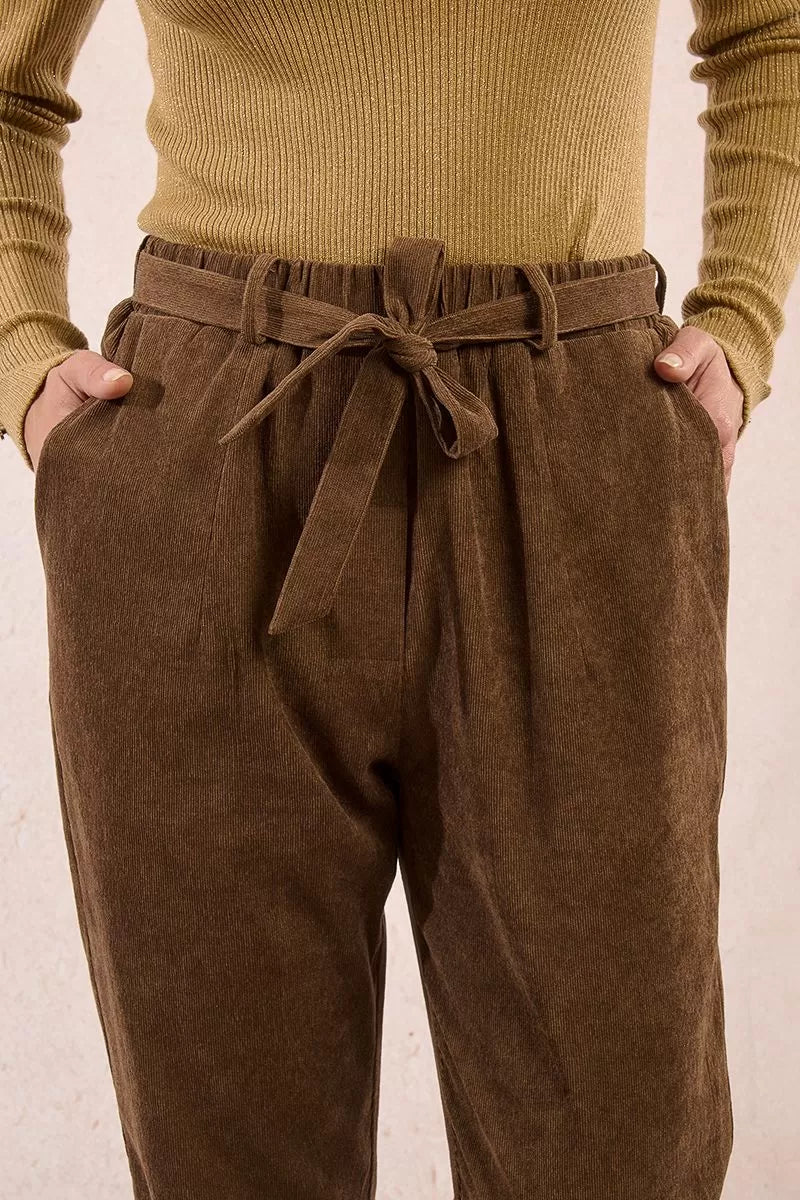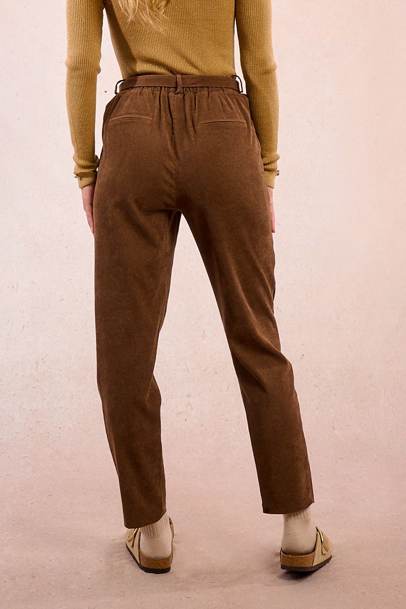 Pantaloni taglio carota -Materiale testurizzato -Vita alta elasticizzata -Cintura da annodare in vita -Tasche laterali -Tasche a filetto sul retro -Taglio aderente sul fondo -Lunghezza laterale 103 cm per una taglia S