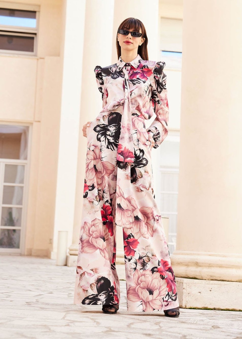 Il pantalone palazzo fiorato visibile nell'immagine è un capo audace e sofisticato, perfetto per chi cerca un look elegante e femminile. Il taglio ampio e fluido del palazzo assicura comfort e una vestibilità che slancia la figura, mentre la stampa floreale in tonalità delicate di rosa, crema e accenti neri aggiunge un tocco romantico e glamour. La vita alta contribuisce a definire la silhouette, rendendo questo pantalone ideale sia per occasioni formali che per un look chic.