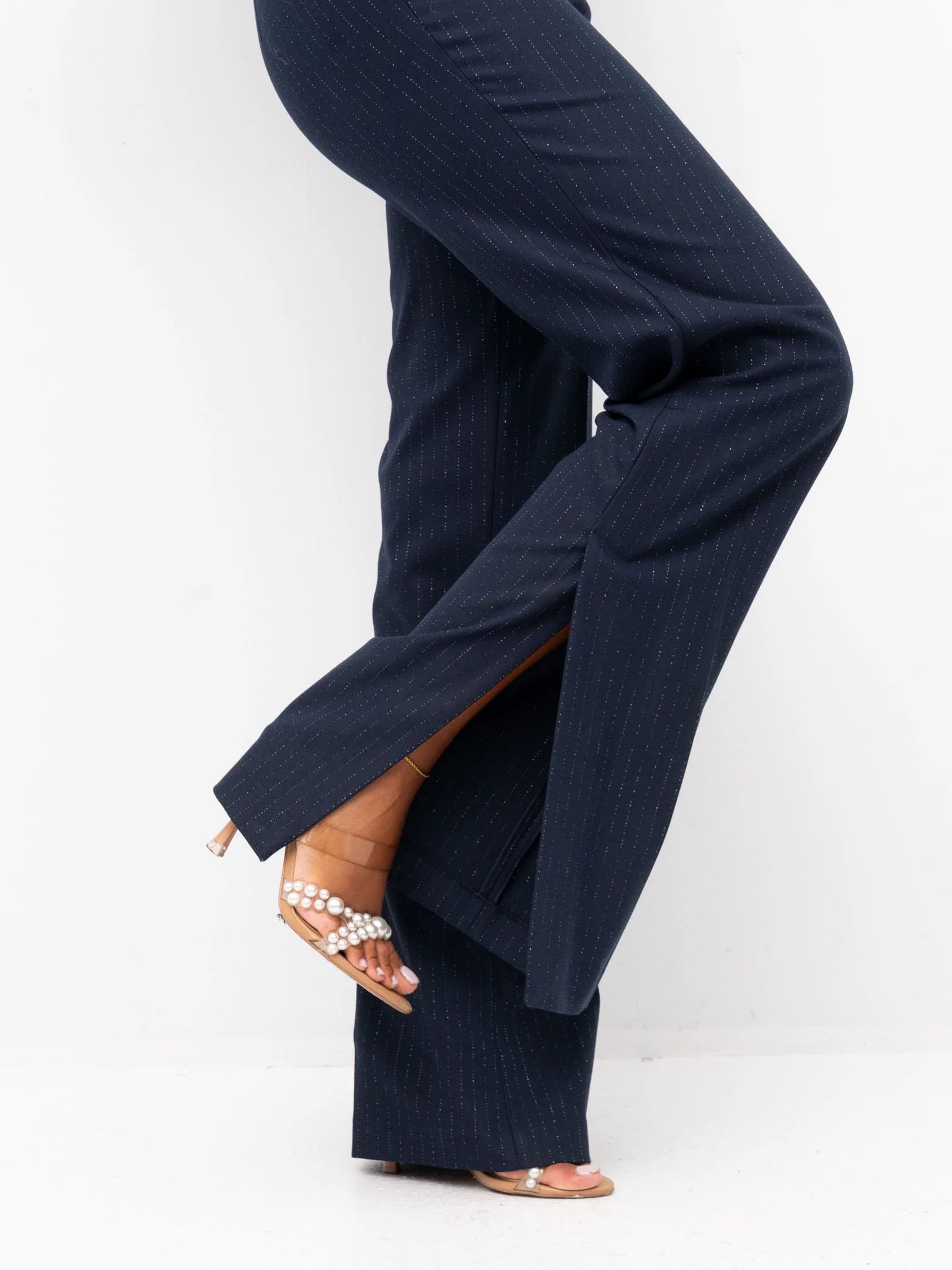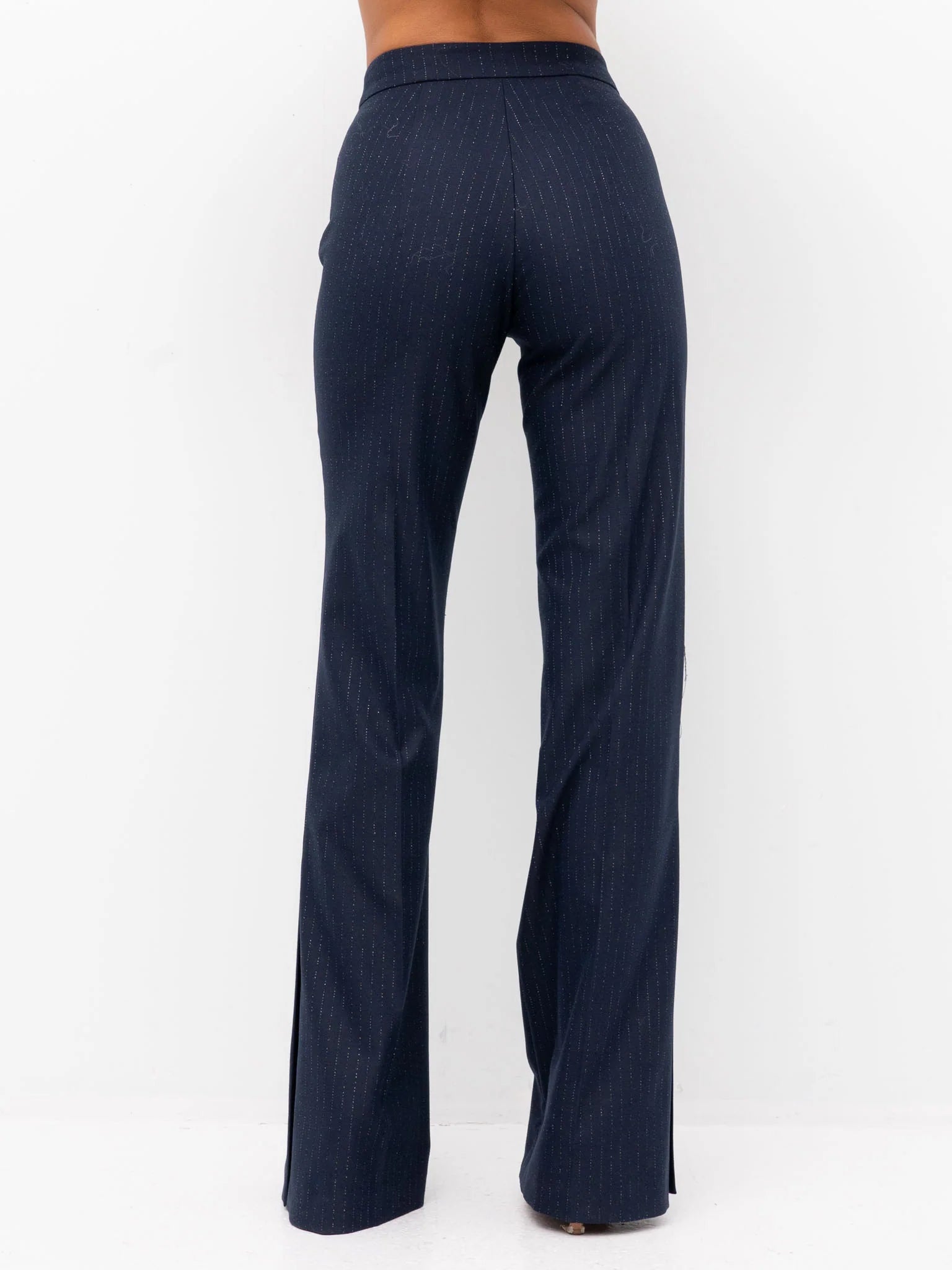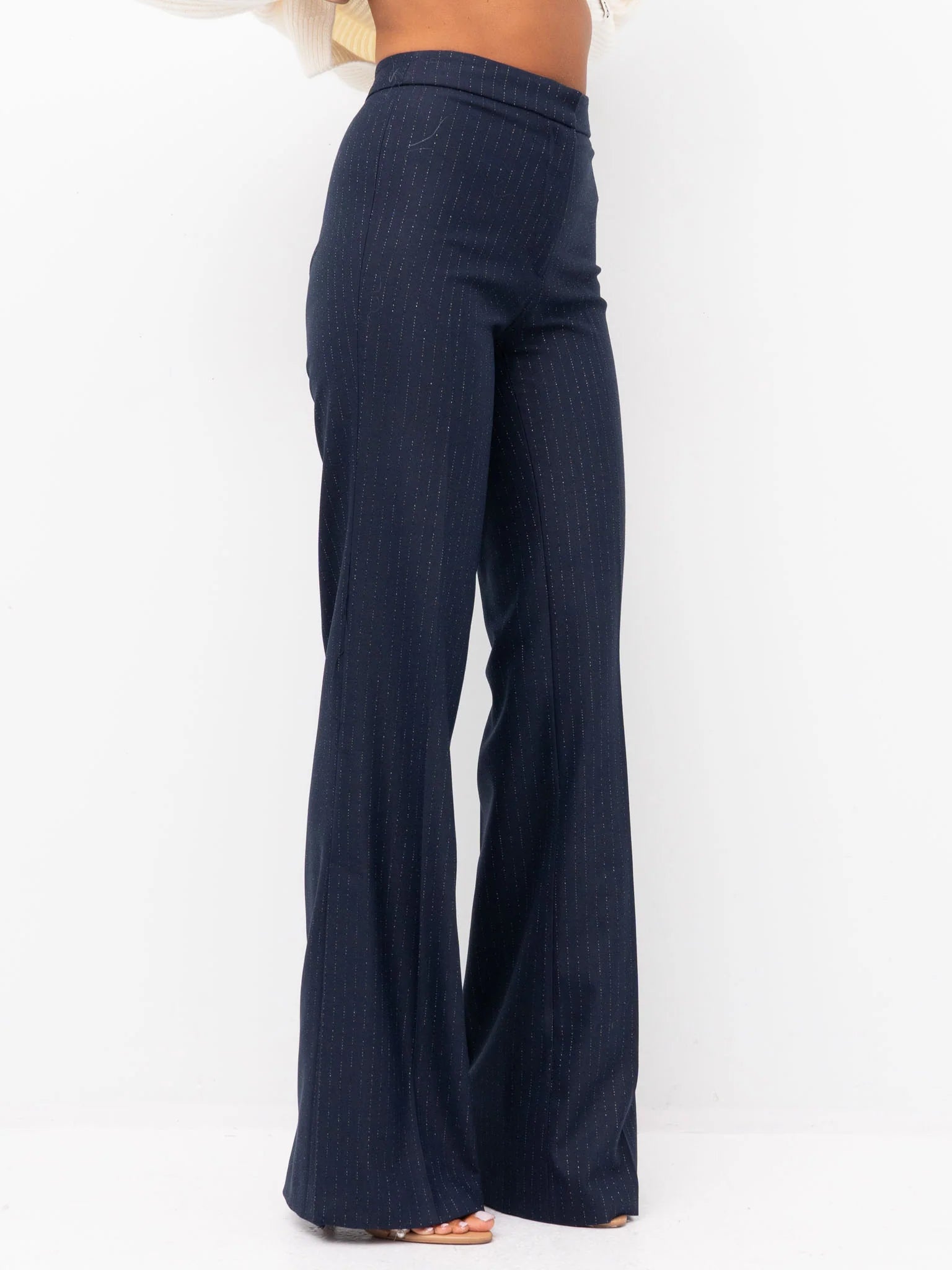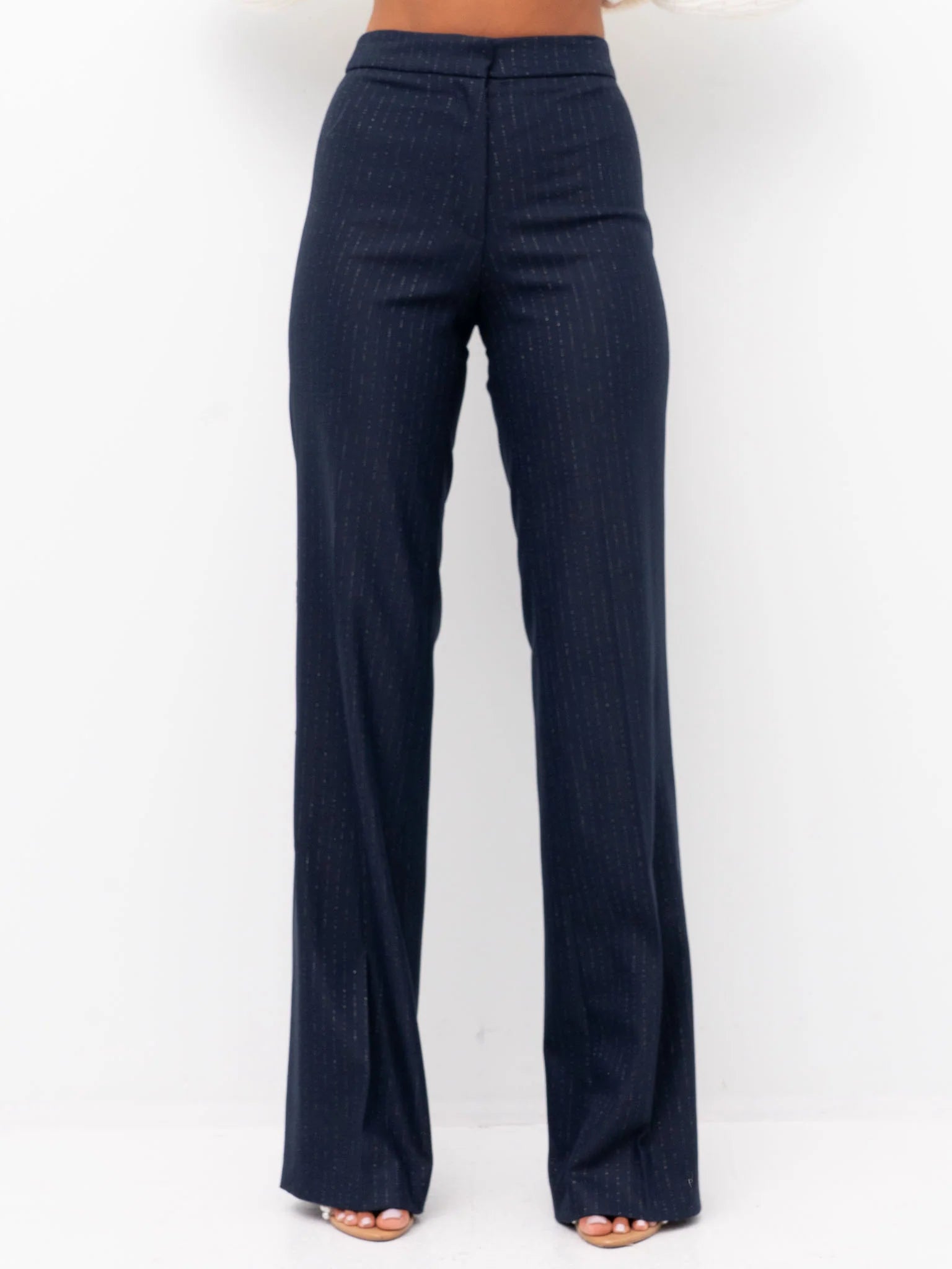 Il pantalone palazzo blu gessato con spacco alla caviglia è un capo che combina eleganza e modernità. Il taglio palazzo, ampio e fluido, esalta la figura donando un tocco sofisticato, mentre le sottili righe gessate verticali slanciano la silhouette. Il dettaglio dello spacco alla caviglia aggiunge un elemento di originalità e femminilità, lasciando intravedere leggermente la gamba in movimento. Perfetto per occasioni formali o per dare un tocco chic a un look quotidiano, questo pantalone unisce la classicità del tessuto gessato con un design contemporaneo e ricercato.