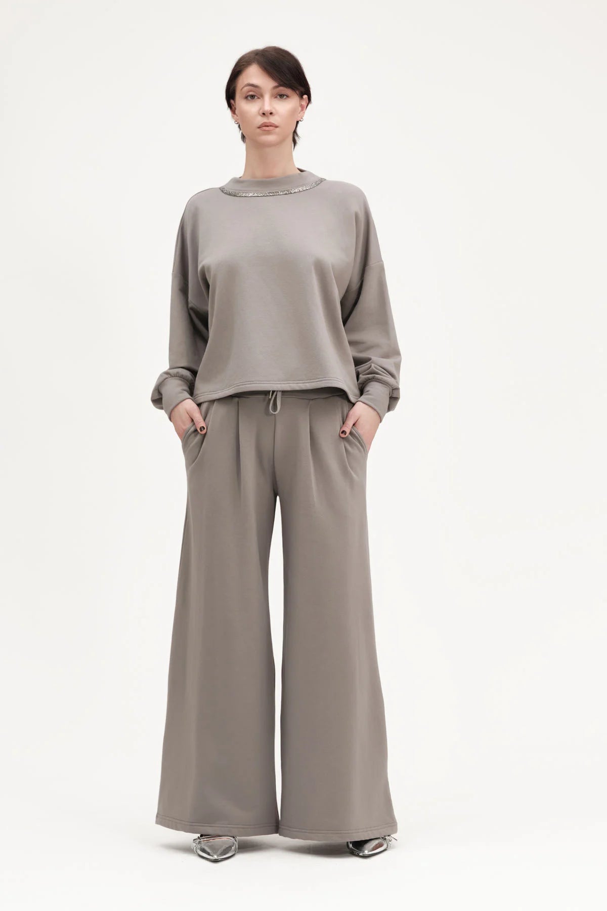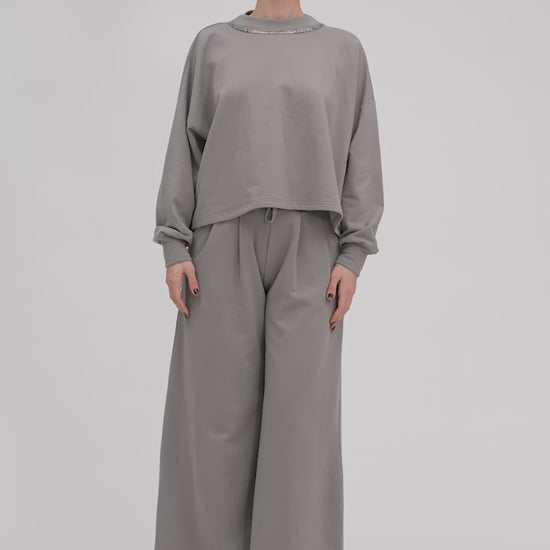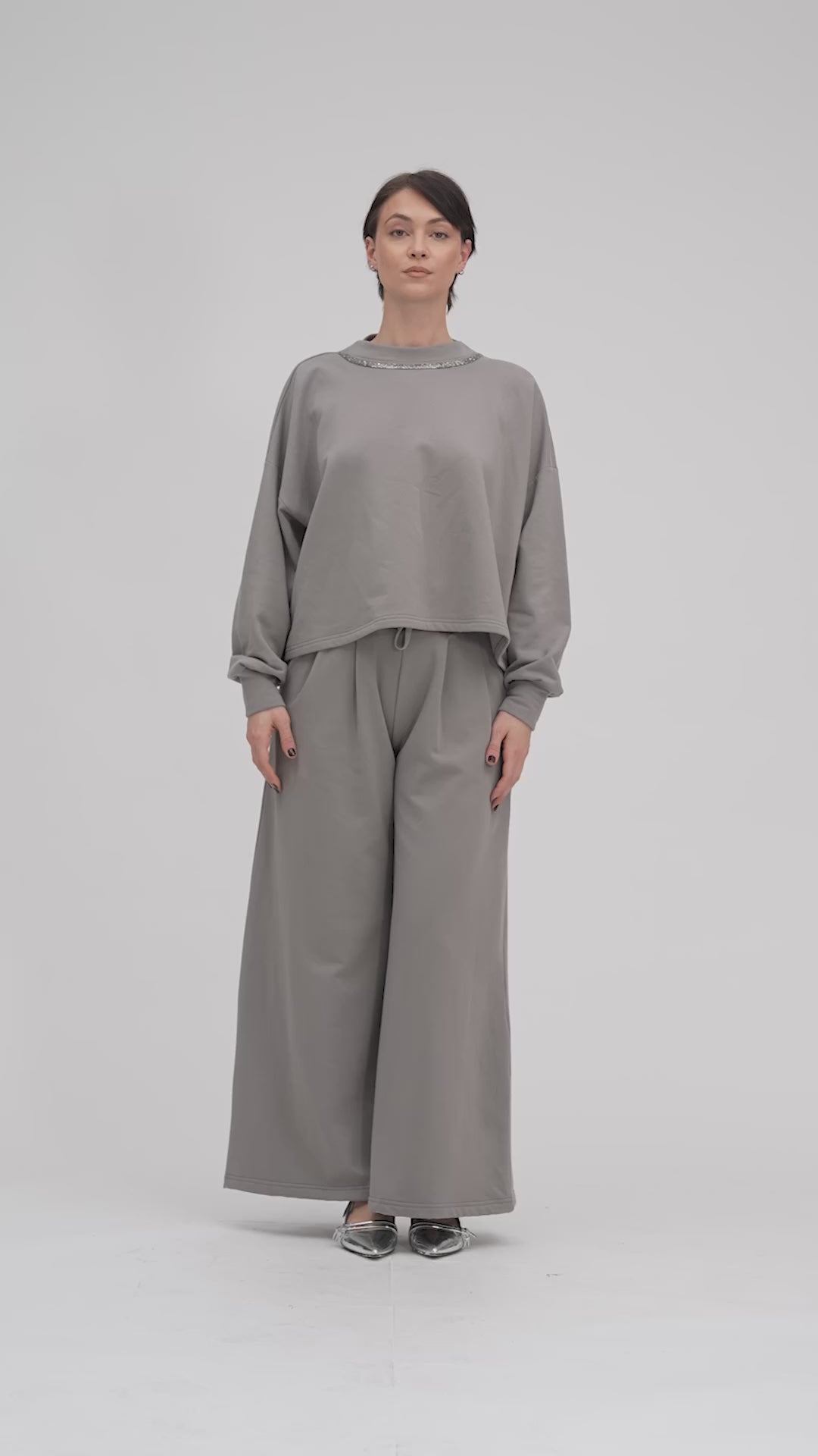Tuta elegante realizzata con passamaneria strass che cattura la luce con raffinata brillantezza. Il design sofisticato combina comfort e stile, perfetto per occasioni speciali o per chi desidera un look distintivo. Disponibile nelle tonalità tortora, nera e panna, si adatta a ogni preferenza cromatica. Un capo versatile che trasforma l'outfit con dettagli preziosi e una silhouette moderna.